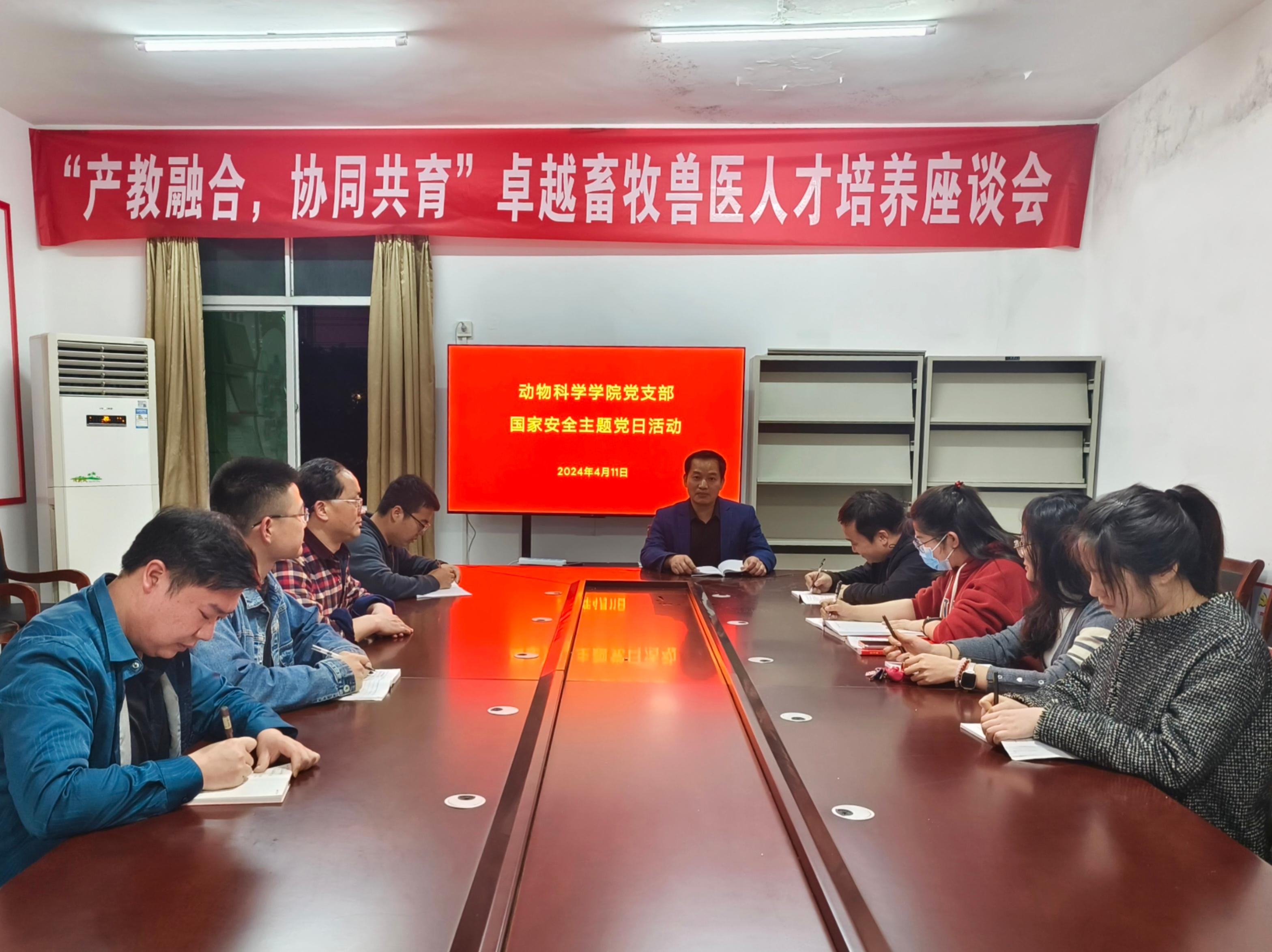 2024 年是习近平总书记提出总体国家安全观 10 周年,4月15日是第九个全民国家安全教育日。为提高党员教师国家安全法治意识,营造维护国家安全的浓厚法治氛围,增强防范和抵御安全风险能力。2024年4月11日,动物科学学院党支部组织全体党员教师开展国家安全主题党日活动。