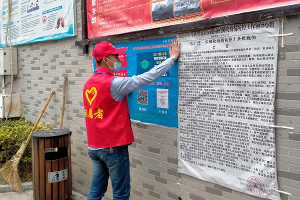 寒假期间,当19动医班杨明志同学得知疫情防控志愿者短缺后,第一时间在他的家乡瑞金市黄柏乡瑞律村报名参加志愿者队伍。在为期半个月的志愿服务工作中,他负责张贴疫情防控告示,同时在社区巡逻劝止居民燃放烟花爆竹,除此之外还在消防通道执勤站岗,维护良好的社区安全环境。他表示作为一名入党积极分子,能为家乡贡献自己的一份力量是一件光荣的事情。