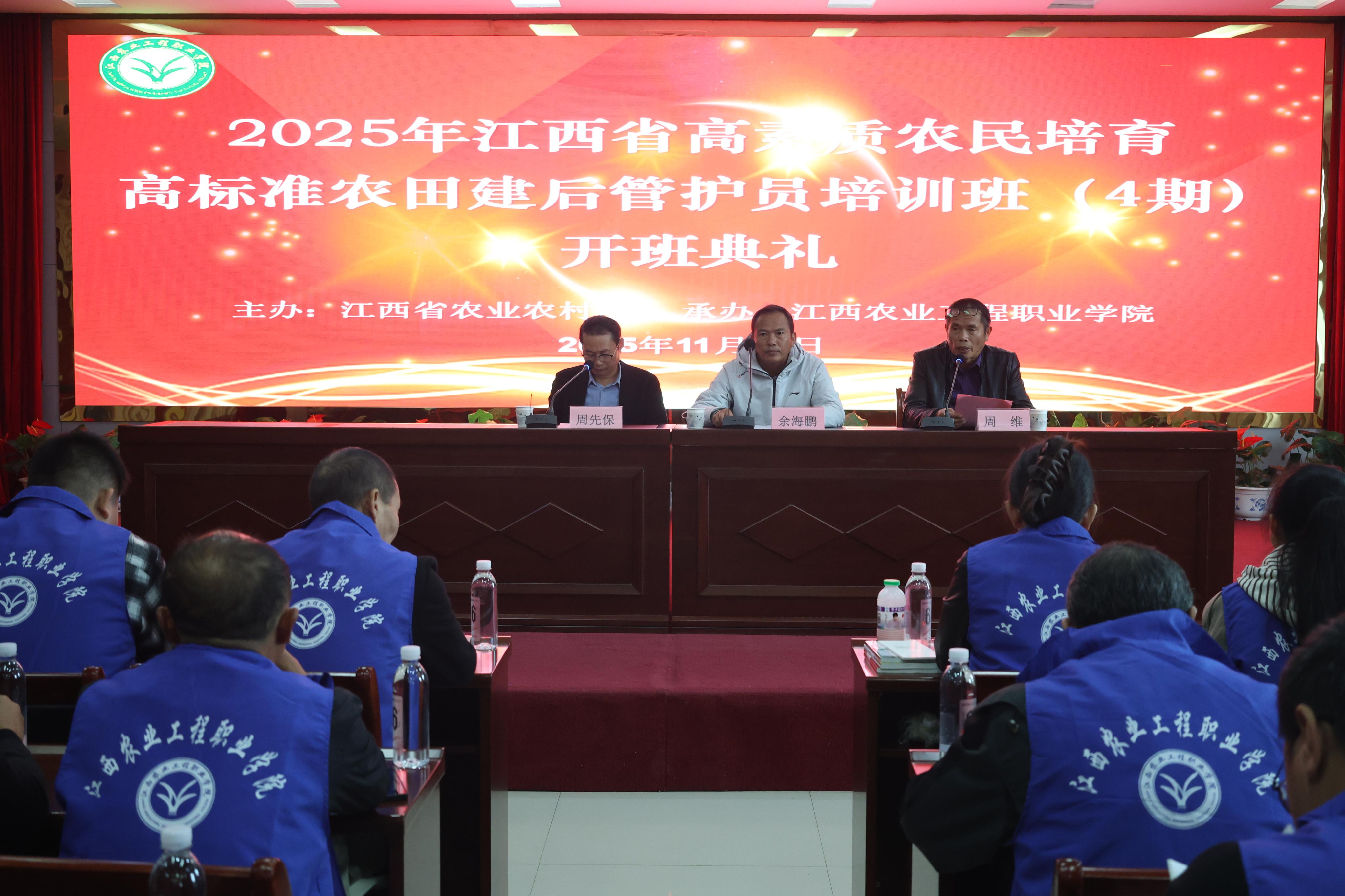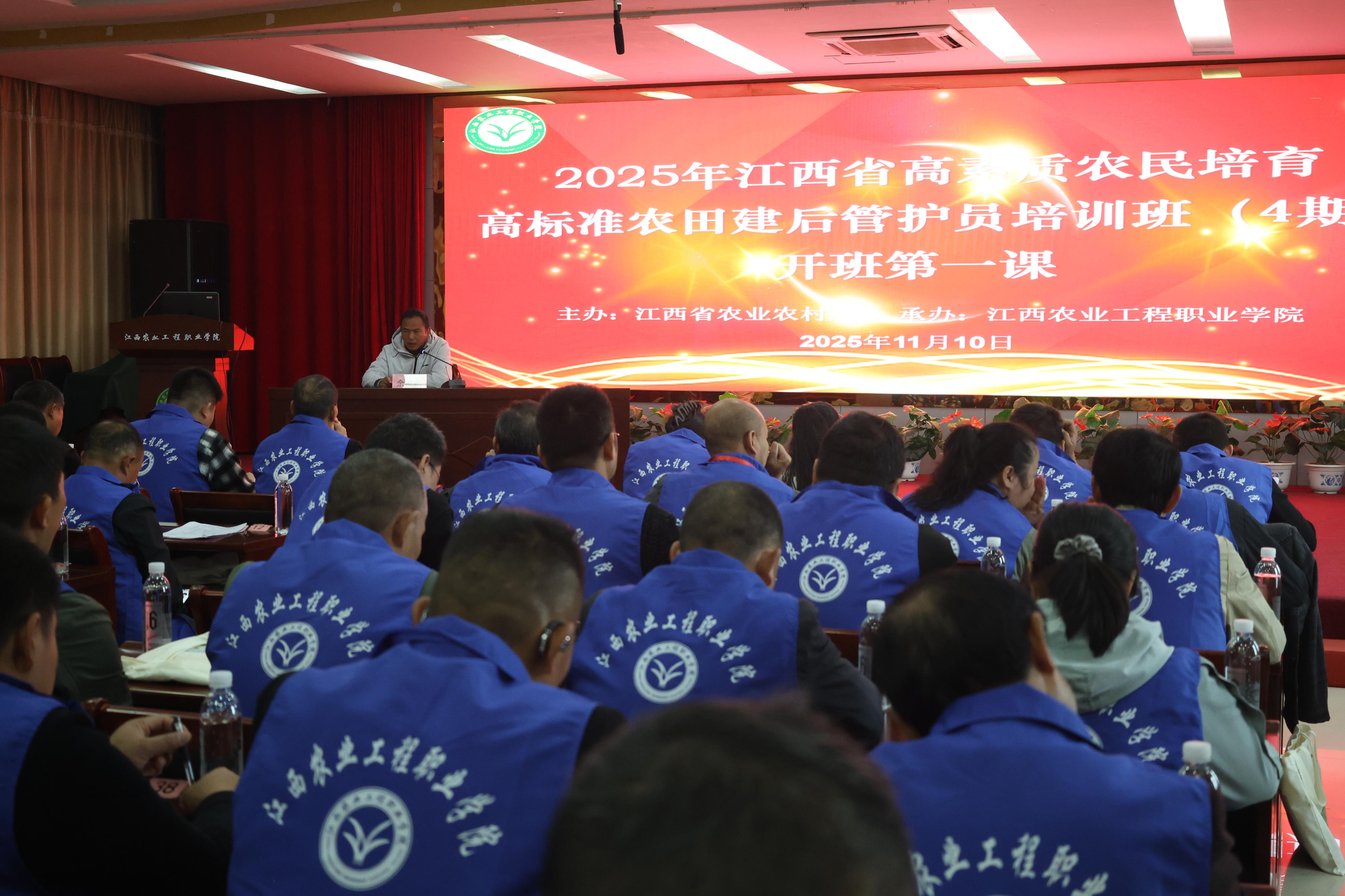 十一月的秋风,和煦舒畅;丰收的季节,硕果飘香。11月10日上午,江西农业工程职业学院在多功能报告厅举行2025年江西省高素质农民培育暨高标准农田建后管护员培训班(4期)开班典礼。学院副院长周维致欢迎词,受江西省农业农村厅农田处委派的樟树市农业农村局副局长余海鹏到会指导工作并讲授开班第一课。来自宜春、南昌等地的50名学员参加了仪式。
