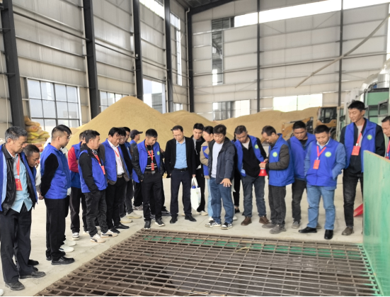 江西千马农业发展有限公司负责人周海平介绍了公司的创建发展历程,详细介绍了公司服务水稻种植全产业链的运营模式,先后参观了育秧中心、烘干中心,学员们围绕育秧施肥和病虫害防治等方面与周海平进行了热烈讨论,在烘干中心,站在烘干设备设施前,周海平说:“要提高烘干效率,下粮坑要足够大,坡度要适当,这个5米长、4.5米宽,坡度40°的下粮坑,下粮速度快,运粮车不用排队……”在公司厂房旁边,学员们和公司员工一起开展打捆机与拖拉机连接安装实训,在田间开展稻草打捆实训。