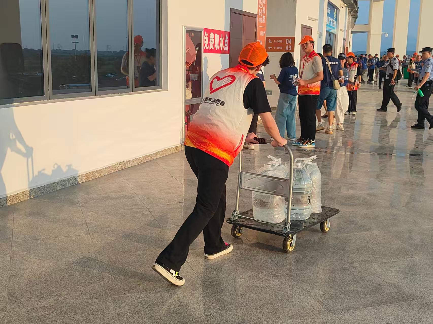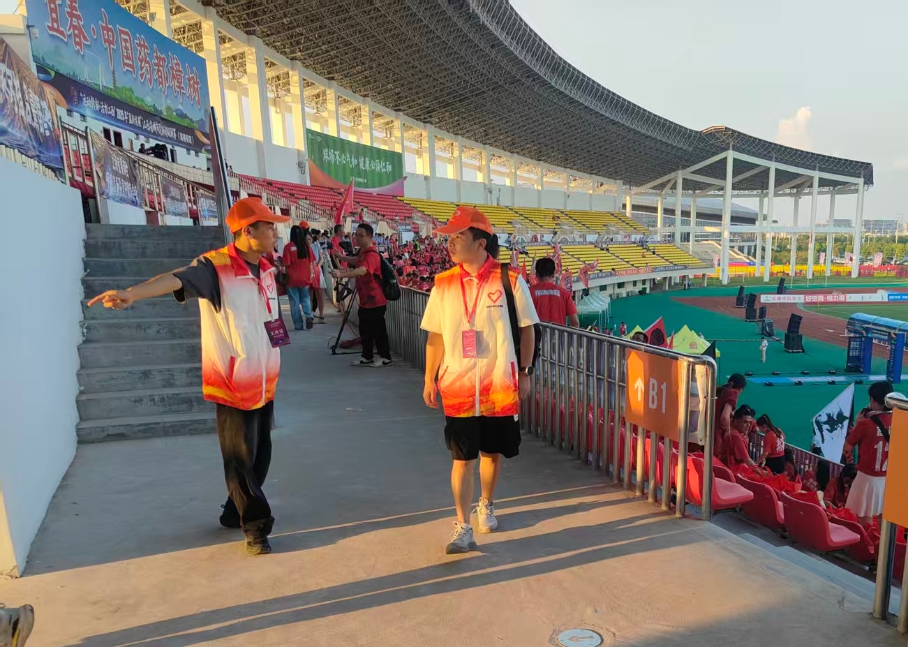 比赛当日,师生志愿者身着统一服装抵达赛场,迅速投入安检引导、观众服务、物资保障等岗位工作。检票组师生协助完成万余人次的门票核验工作,耐心提示观众禁带物品,以严谨态度筑牢安全防线;看台服务组分布于各楼层平台,引导观众有序入座;物资组则高效完成饮用水配发与回收任务,有力保障了赛事的顺畅运行。