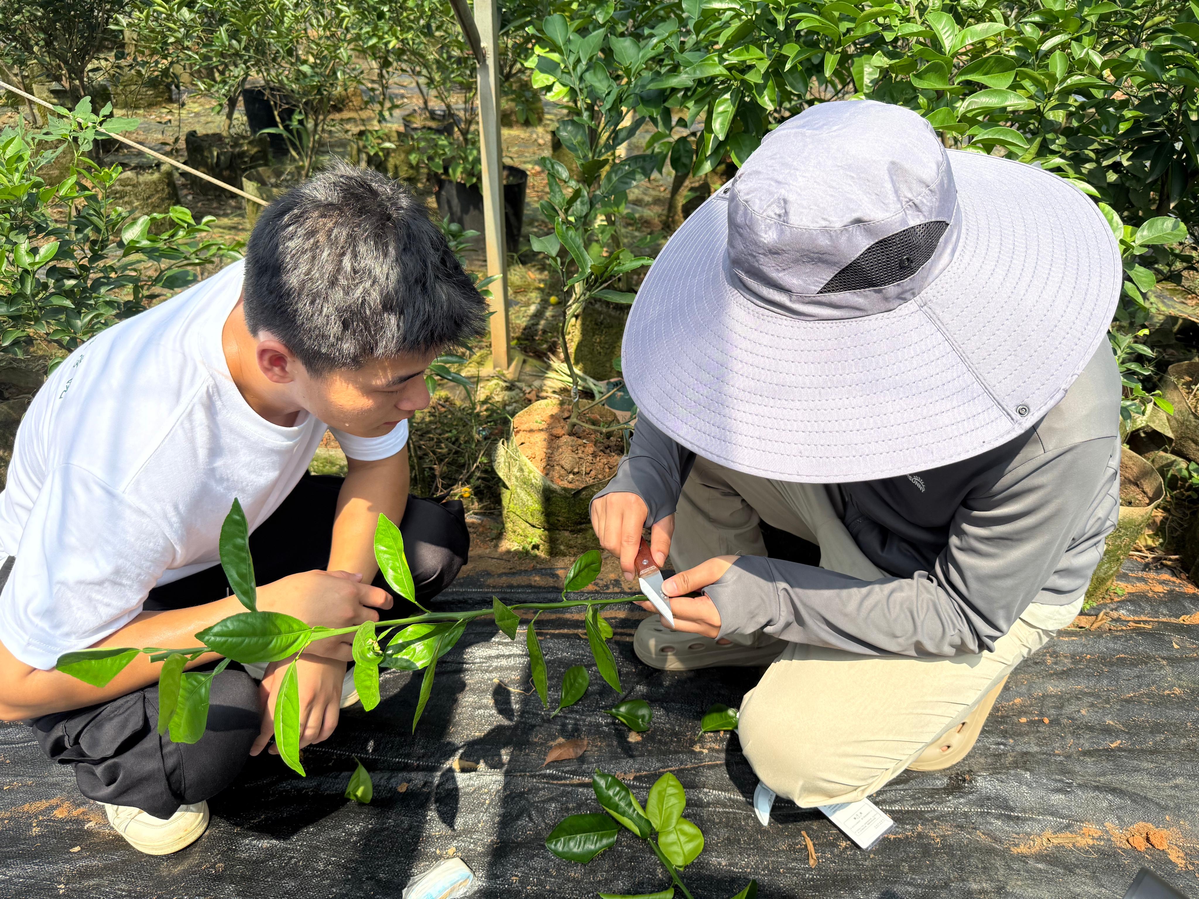 走进双金园艺场,药香扑面而来。技术员向队员们介绍了技术创新成果——“吴茱萸矮密早GAP丰产栽培技术”,由此带来的亩产和效益“撑杆跳”也让队员们对科技赋能乡村振兴有了更真实的感受。在“研学实践田”,队员们化身“药农”撸袖挥铲、拌土栽苗、嫁接扦插,体会从“一粒种”到“一株药”的艰辛。