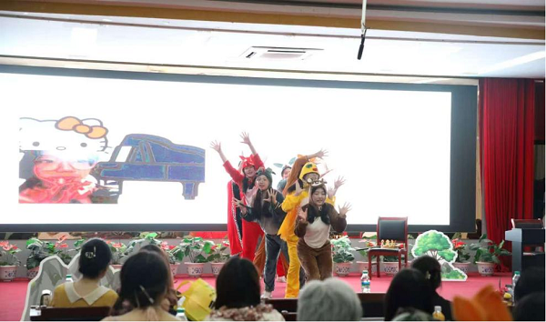 参赛队伍围绕选定主题,自主进行活动设计,从故事讲述、歌曲弹唱、舞蹈表演三大维度展开比拼,全方位考察学生的语言表达、乐器弹奏、舞蹈编排等核心技能。比赛现场气氛热烈,节目应接不暇。在弹唱环节,选手们自弹自唱经典儿歌《小红帽》《灰太狼与喜洋洋》等,展现出扎实的弹奏技巧。舞蹈环节则聚焦幼儿舞蹈创编与演绎,《蓝精灵》《大王叫我来巡山》等充满童趣的曲目轮番上演,灵动的舞姿尽显青春活力与专业功底。
