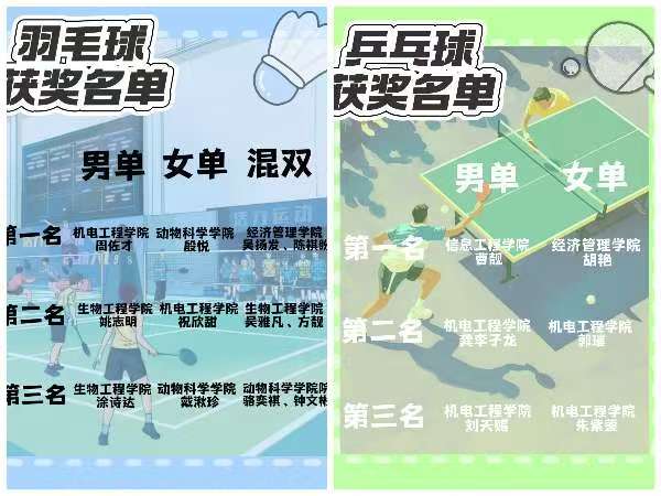本次大赛于4月26日圆满收官,经过一个月的准备与激烈角逐,最终动物科学学院殷悦获得羽毛球女单组冠军、机电工程学院周佐才获得羽毛球男单组冠军、经济管理学院吴扬发、陈祺盼获得羽毛球混双组冠军;经济管理学院胡艳获得乒乓球女单组冠军、信息工程学院曹靓获得乒乓球男单组冠军。