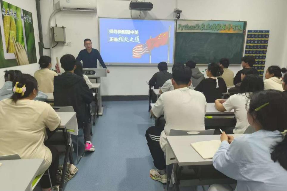 4月9日晚,李建喜以《探寻新时期中美正确相处之道》为题,给信息工程学院学生讲授思政课,他表示,推动构建人类命运共同体是新时代中国特色大国外交的总目标,也是中国特色大国外交最鲜明的特征。作为新时代青年学生,需要全面了解世界发展大势,认清肩负的时代责任和历史使命,为实现中华民族伟大复兴中国梦贡献自己的青春和力量。