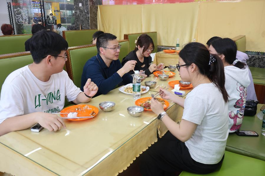 4月9日中午,李建喜走进第二食堂,和学生一道排队打饭,和同学们边吃边谈,细心询问食堂饭菜口味、质量以及食堂服务的看法和建议,并耐心听取学生对学校食堂改进的意见。