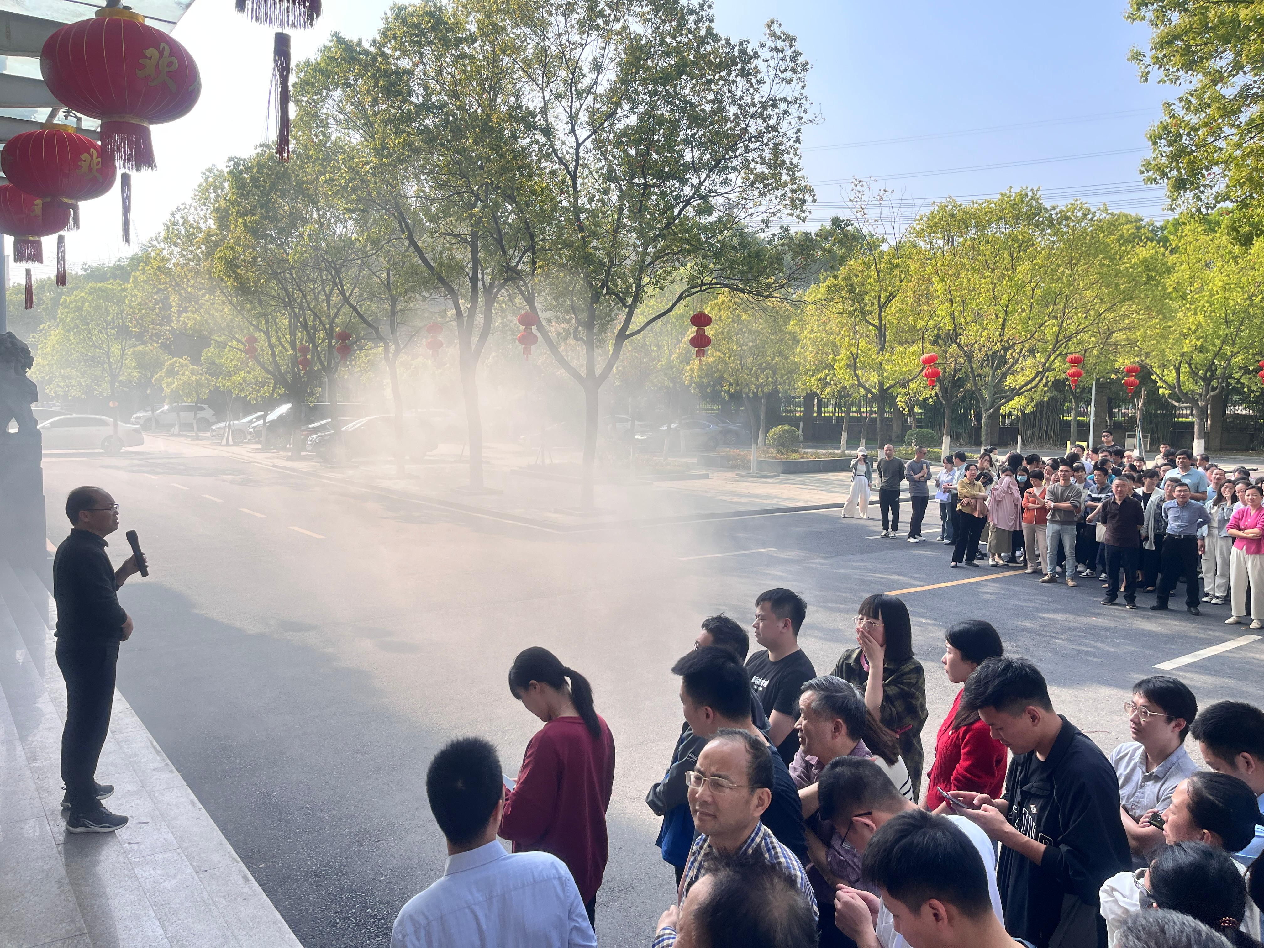 下午四点,烟雾小组在惟公楼、惟朴楼随机选择楼层点燃烟雾弹,消防警报随之响起。面对突如其来的“火情”,教职工们迅速反应,做捂住口鼻状,弯腰低姿,沿着安全疏散通道有序撤离办公楼至空旷地区。为确保演练的安全性,安排了专业医护人员现场待命,随时应对可能发生的意外情况。