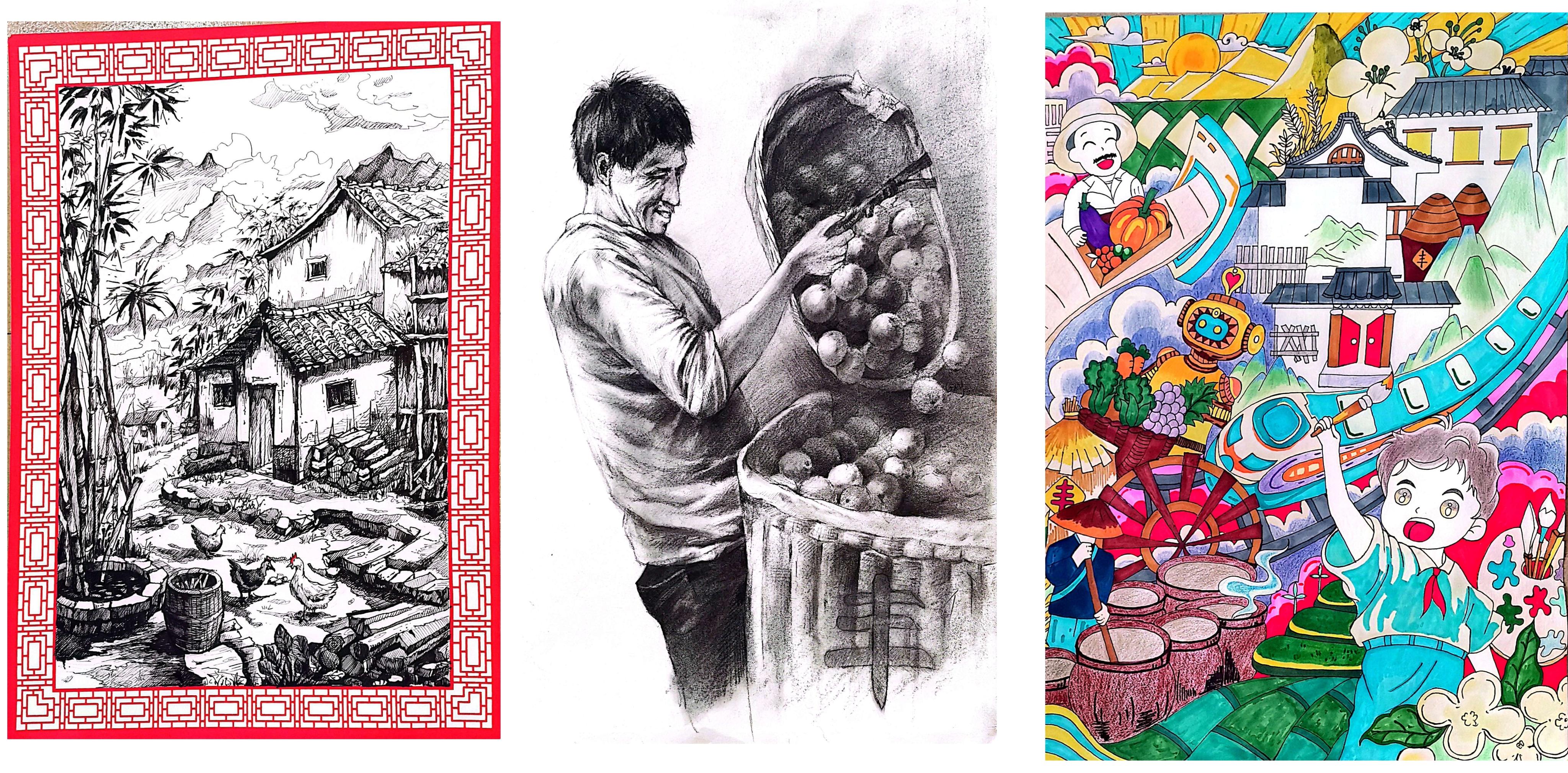一支画笔,一张画纸,一颗心灵,绘就乡村发展新画卷。黄小嘉同学以细腻的笔触,创作《山居竹影》,画出了乡村生活的舒适、宁静以及国泰民安。高晓燕同学的《赣丰收》,捕捉赣南特色农产品脐橙丰收场景,以速写的笔法,定格农民的幸福瞬间。把握新农村发展的时代脉搏,刘春霞同学用颜料图画多彩的乡村,用色彩“响应时代召唤”。