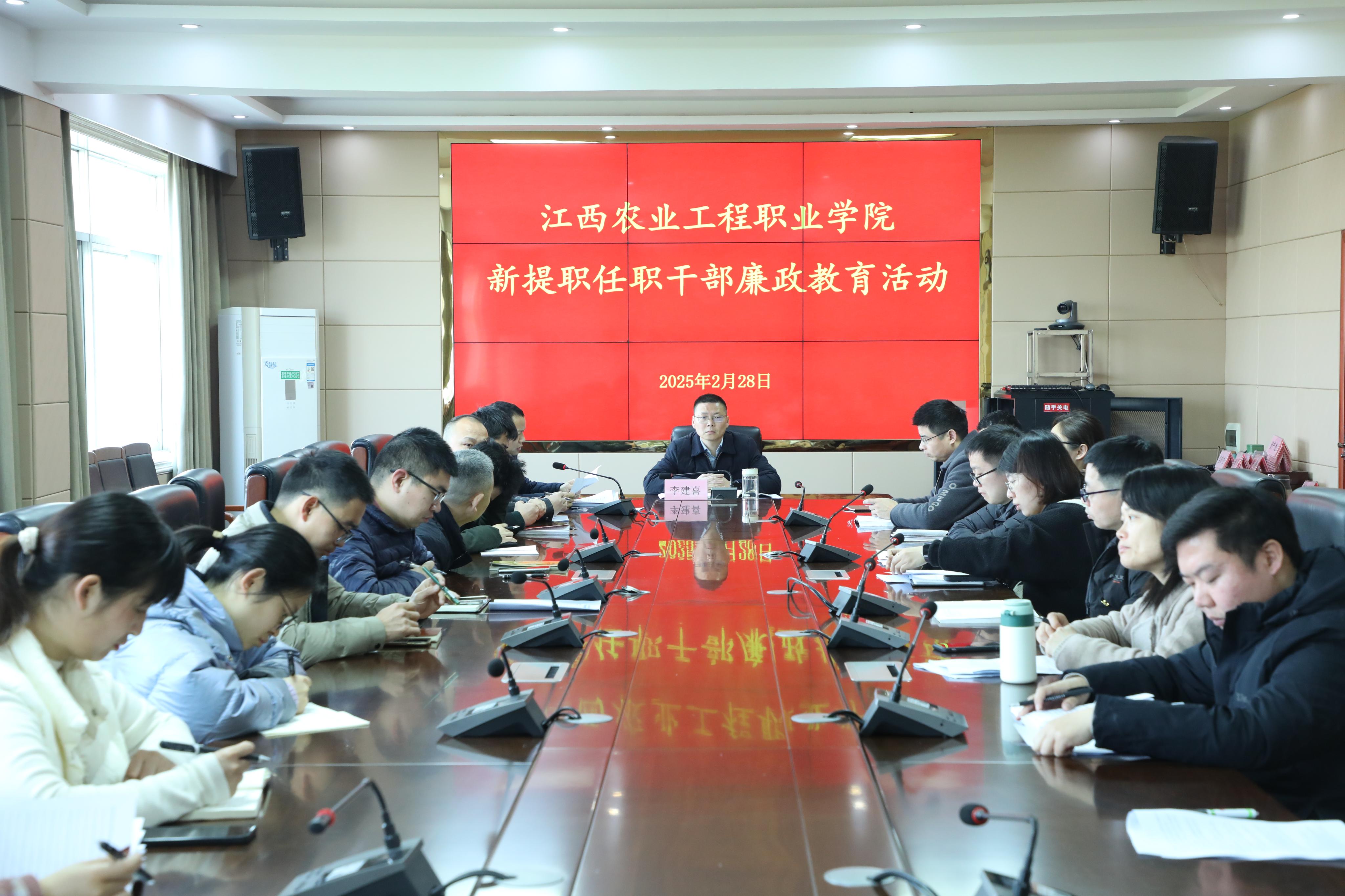 为贯彻落实党的二十届中央纪委四次全会和省十五届纪委五次全会精神,推进学院党风廉政建设,切实加强新提职任职党员干部廉政教育,2月28日,学院纪委组织2024年以来新提职任职干部开展“五个一”廉政教育活动。学院党委委员、纪委书记李建喜参加活动并进行集体廉政谈话。