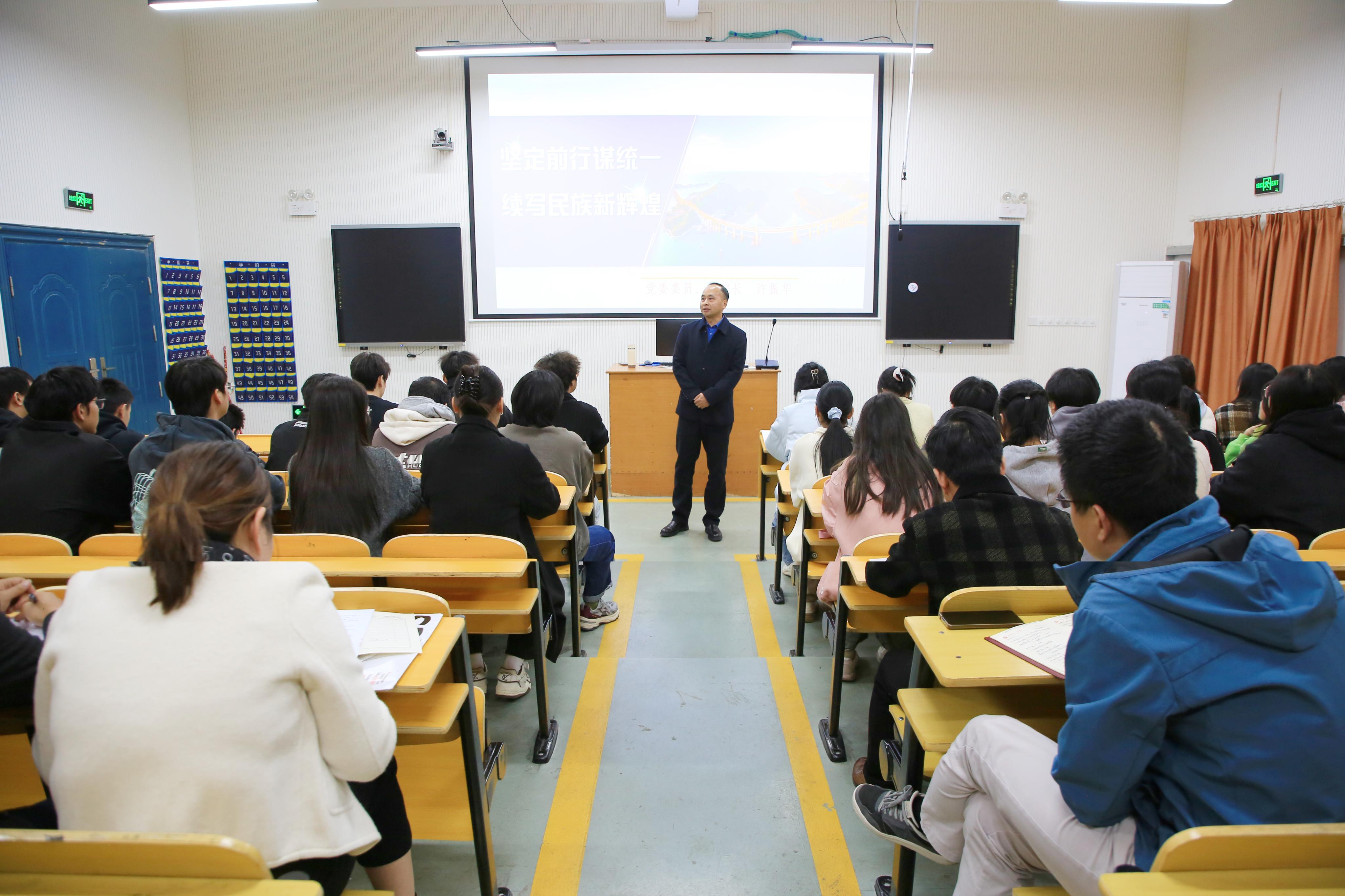 晚上7时,许振华在第三多媒体室为机电工程学院全体党员和入党积极分子讲授以《坚定前行谋统一,续写民族新辉煌》为主题的思政课。课程以台湾问题和一带一路两个话题导入,从立足长远把握两岸关系大局、台独分裂图谋注定失败、鉴定不移推进祖国统一进程三个版块为大家上了一堂精彩生动的思政课,讲述了大量的历史事件和时事政治,用通俗易懂的语言加深了大家对授课内容的理解。课堂上,许振华勉励同学们要努力学习,做堪当大任的时代青年;要以身作则,以自己的一言一行影响身边的同学;要通过不断实践,加强综合素质的培养。