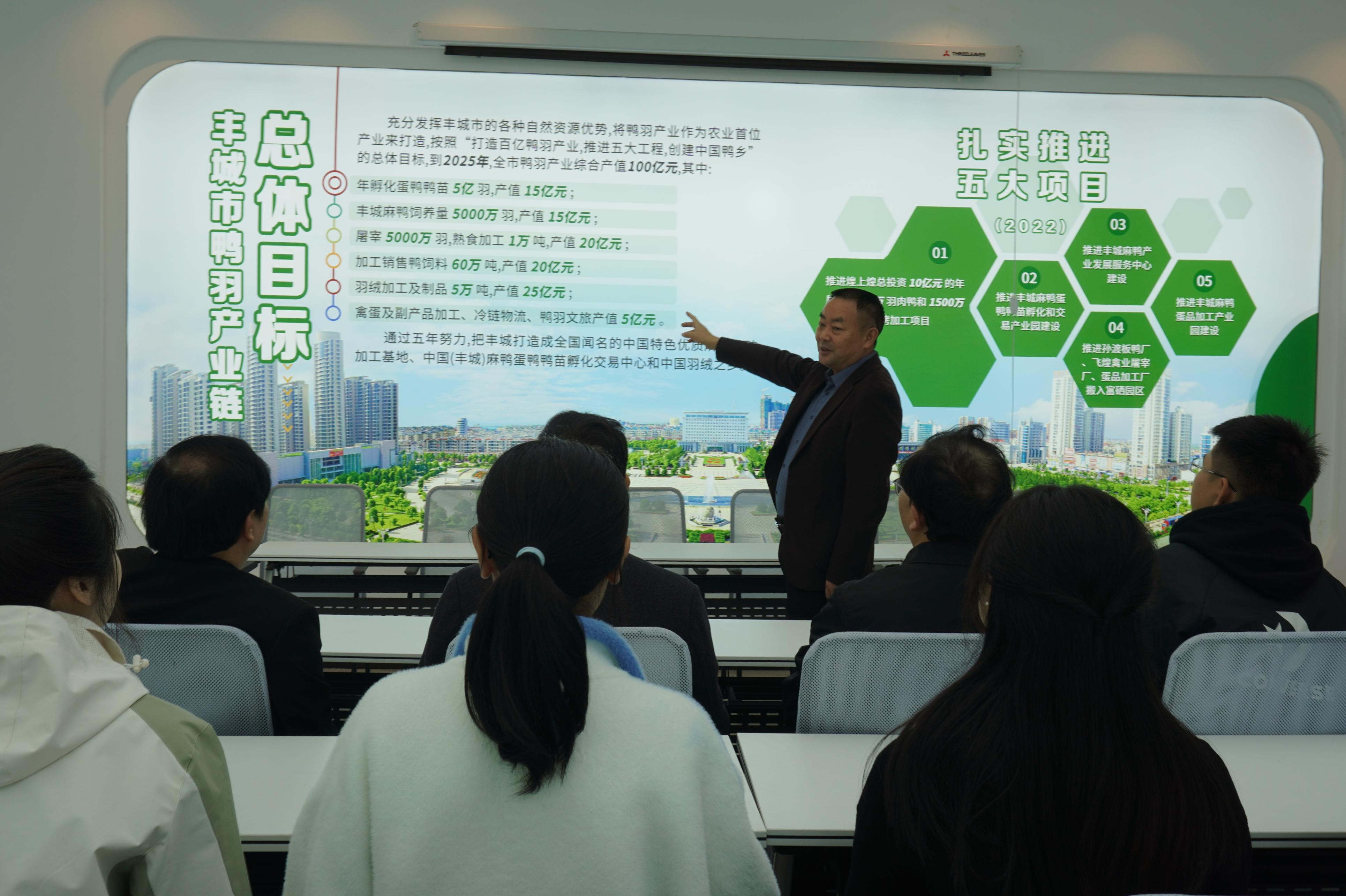 动物科学学院党支部负责人一行到现场参观了十几万羽规模的丰城麻鸭现代化小水系养殖基地,在近距离参观产业基地和养殖场的过程中感受企业数字化生产的有序推进。随后,企业负责人从麻鸭的养殖地、养殖过程、养殖方式和产品种类等多个方面向大家介绍了企业的发展运行状况,以及相关岗位的工作内容、住宿条件、公司福利等。双方表示将深化校企合作,携手服务好区域经济发展。
