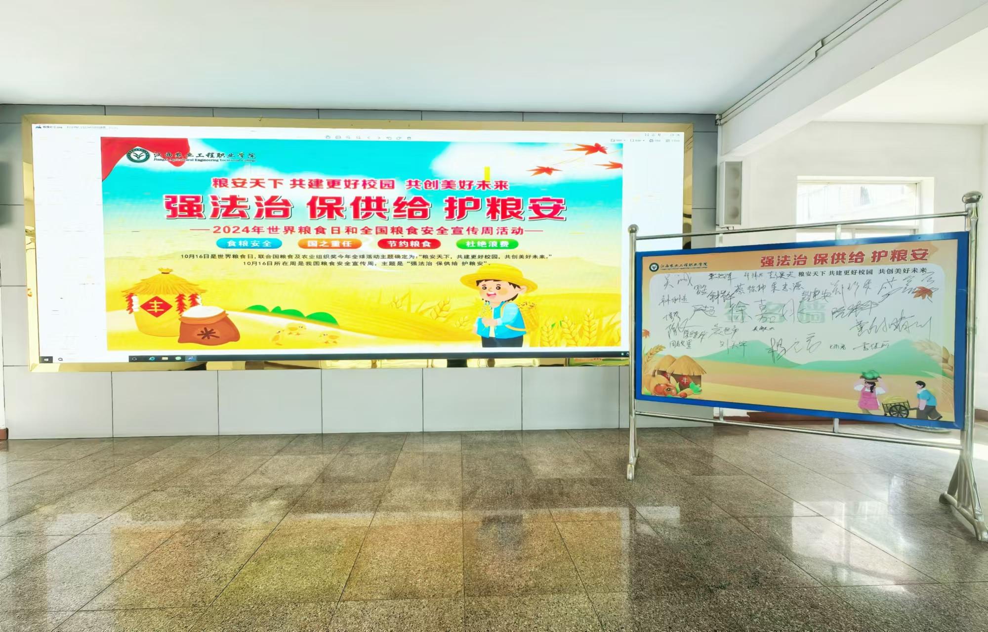学院通过校园广播、宣传栏、电子屏、签名墙等多种形式开展与粮食安全相关知识与法律法规宣传,广泛宣传粮食安全的重要性和本次活动的主题。校园内随处可见的宣传标语,营造出节约粮食、厉行节俭的良好风尚。