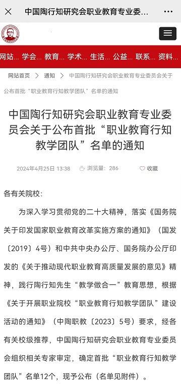 为落实《关于推动现代职业教育高质量发展的意见》等文件精神,推动职业院校科研工作,提升职业院校科研能力,中陶会职教委会于2023年12月开展职业院校“职教行知科技创新团队”建设活动,旨在践行陶行知先生“教学做合一”教育思想,创造教育精神,总结和推广职业院校教育科研成果和实践经验,推进科技创新赋能职业教育,推动职业教育科技创新,提升职业院校科技创新能力。