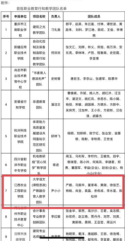 日前,中国陶行知研究会职业教育专业委员会公布首批“职业教育行知教学团队”名单,我校“大学语文(课程思政)产教融合育人教学团队”成功入选。首批“职业教育行知教学团队”共12个,来自全国10个省(自治区、直辖市)高、中等职业学校。