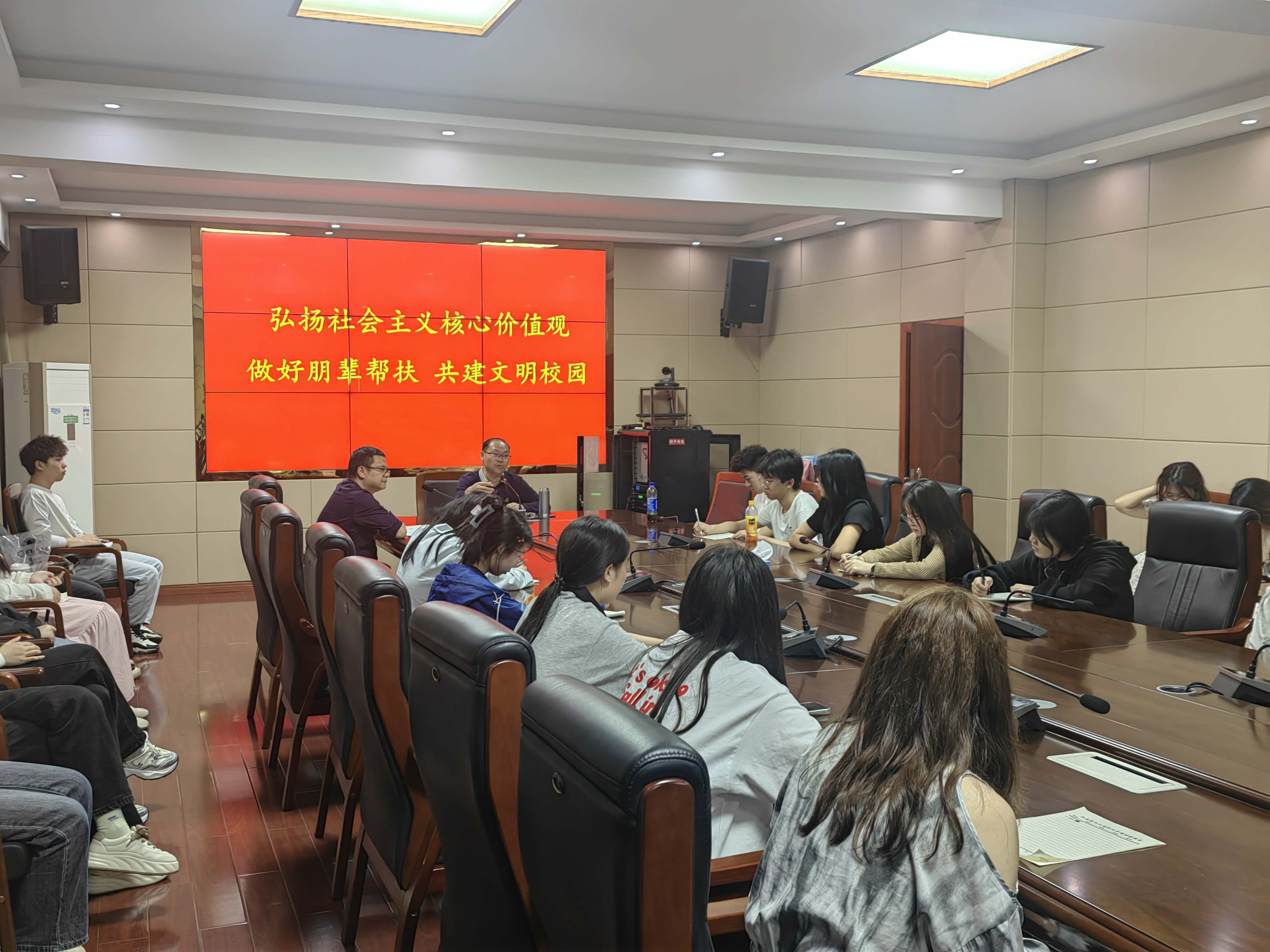 吕湘江召开分院各班班干部代表座谈会,以《弘扬社会主义核心价值观,做好朋辈帮扶,共建文明校园》为题,为学生干部上了一堂生动的思政课。他从如何当好学生干部、如何锻炼自己,服务同学,要求发挥朋辈作用,在学业、心理等帮扶中起积极作用,为共创文明校园努力奋斗。