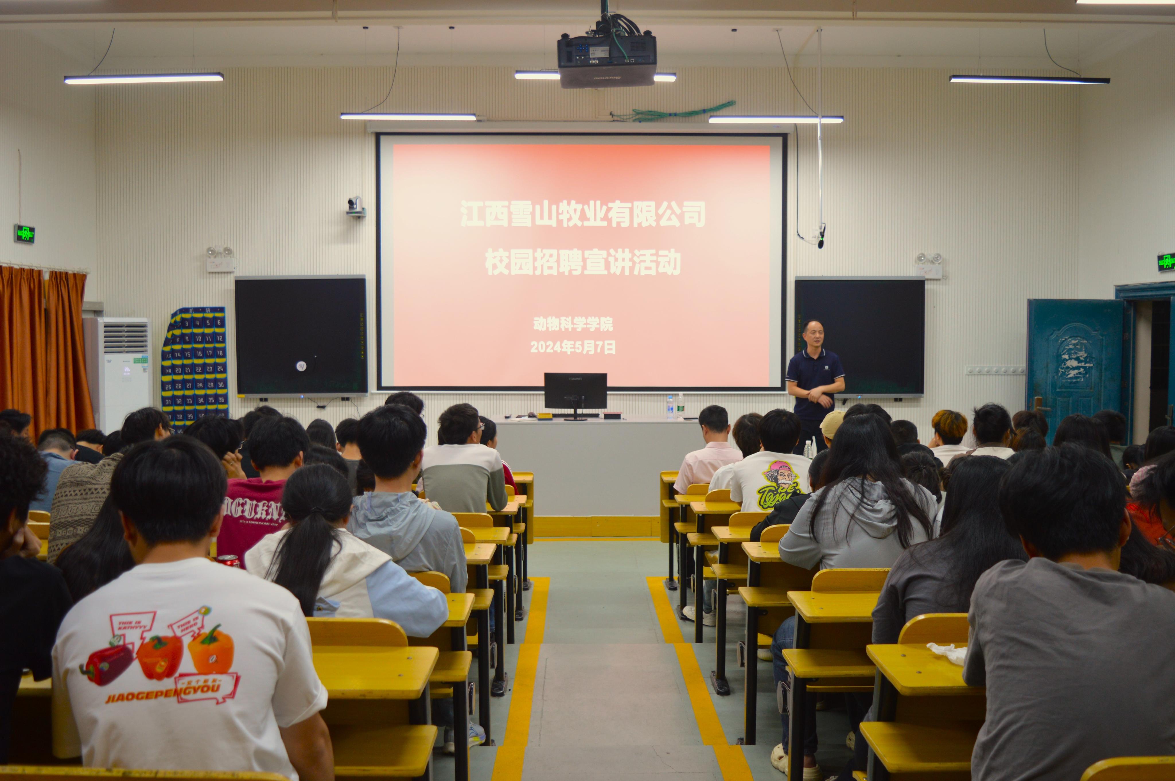 为深化校企合作,满足企业与学生的双向选择需求,江西贝贝宠物医院、江西雪山牧业有限公司分别于5月6日、5月7日来到我校,在第二和第五多媒体开展校园招聘宣讲会。 动物科学学院畜牧兽医、动物医学等相关专业学生参与此次宣讲会。