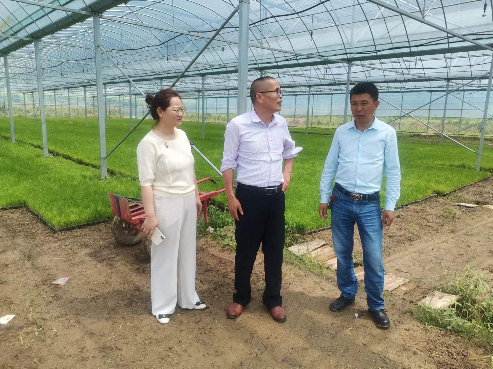 城山镇东港社区育秧中心为村级集体经济产业,东港社区党支部书记、主任王江洪是中心负责人,曾参加学院村级集体经济培训。周维一行在育秧大棚,一边看着工人搬运秧盘,一边听取了育秧中心的创办建设历程的介绍,还与王江洪交流工厂化智能育秧的工作流程。其中,王江洪表示,目前搬运装卸秧盘主要依靠人工,机械化程度很低,准备完善农事服务中心的建设,在这方面需要技术培训和支持。在中心厂房参观了水稻机械播种生产线,王江洪介绍了装填基质、播种、洒水、覆盖和装盘等工序。