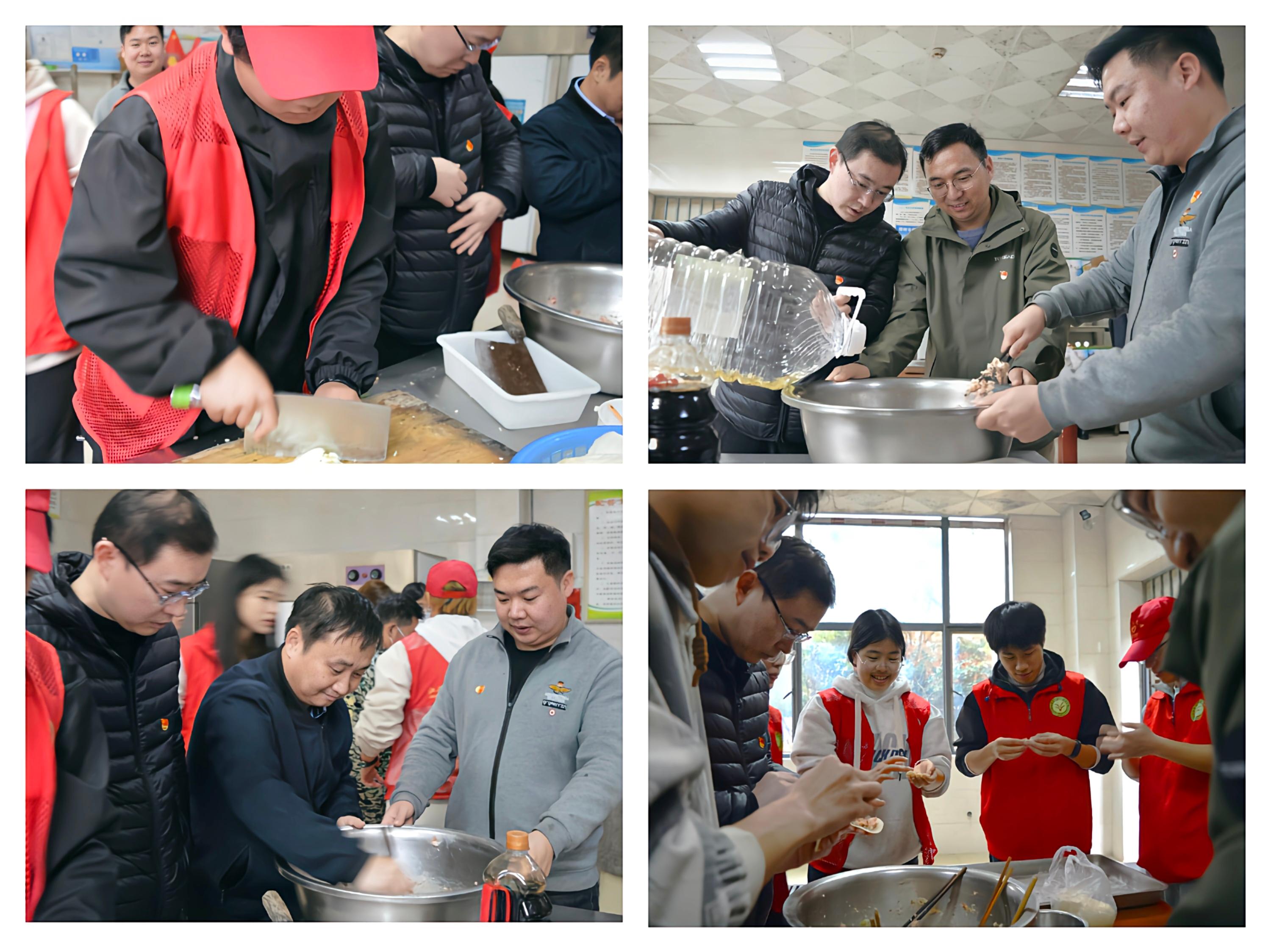 一到活动现场将水果、牛奶等慰问品放下后。教师党员们便热情真切、以身垂范,握住老人们的手闲话家常,关心老人们身体状况,叮嘱他们一定要适当活动、注意休息、保重身体。随后进入厨房内,师生们一起洗菜、和馅、包饺子,分工有序地为老人们准备晚餐。