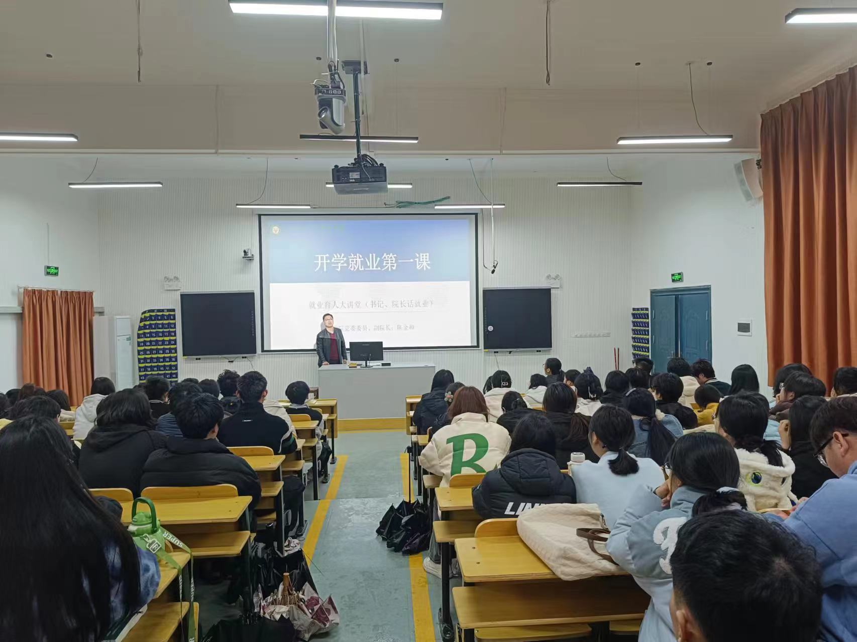本次讲座围绕“如何树立正确的就业观、规划好未来的职业方向、为实现好就业而努力奋斗”三个方面展开授课。课上,陈金和首先基于当前严峻就业形势,从国家就业形势、就业方针政策、毕业生就业特点三个方面进行了讲解,使同学们对当前的就业环境有了全面且深入的认识。随后,陈金和分享了自己的职业生涯和深刻感悟,鼓励学生们趁年轻要敢想敢拼,同时结合自己的成长经历,为学生们提出了几点发展建议。一要学有所获,学有所想。广泛学习,丰富知识体系,把理论知识运用到实际当中去。二是要树立正确的成才、职业和就业观。制定计划,深入学习专业理论,掌握专业技能。三是要积极行动,落实就业。要认真做事、踏实做人,积极参加招聘活动,主动、细致地应聘工作。