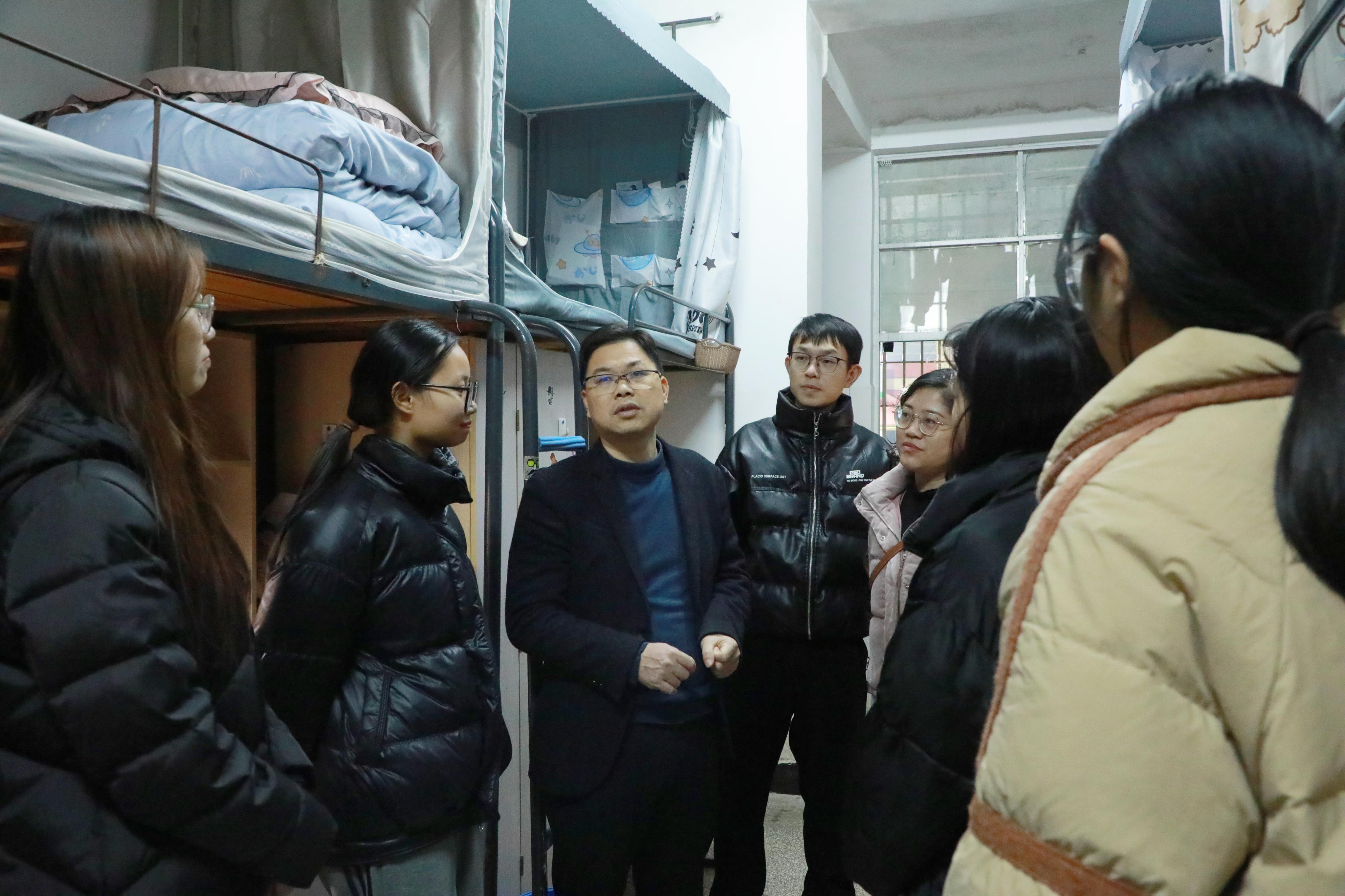 晚间,陈金和又走访了学生寝室。与同学们热情攀谈,关心同学们的生活状况,了解同学们在生活上遇到的困难和不便之处。