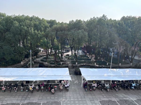 本项目在书香园停车场南面建设双向双列停车棚及养生馆院内西侧建设单向单列停车棚,规划停车位100余个。经科学合理规划、精心组织施工,近日,经多部门联合完成了对项目的验收工作,各验收成员部门代表充分肯定了项目的建设成效。车棚采用钢结构支撑,以膜结构作顶棚,既牢固又美观,目前新车棚内停放的自行车、电动车摆放有序、规范。