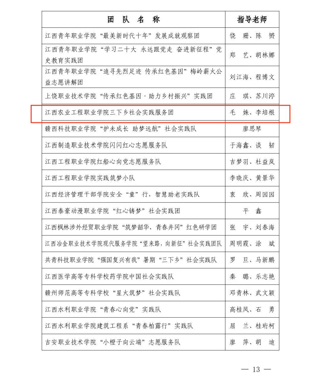 12月12日,中共江西省委宣传部、江西省文明办、江西省教育厅、共青团江西省委、江西省残疾人联合会、江西省学生联合会公布《关于2023年江西省大中专学生志愿者暑期“三下乡”社会实践活动的通报》。其中,学院三下乡社会实践服务团获得省优秀团队称号,学院李星宇、黄万书、徐妍三人获得省优秀个人称号。在“强国有我、青春有为”暑期社会实践活动中,学院胡原顺获得省优秀个人称号,张子涵、张娟等6人撰写的《助力乡村振兴,踔厉奋进新征程》获得优秀调研报告二等奖。