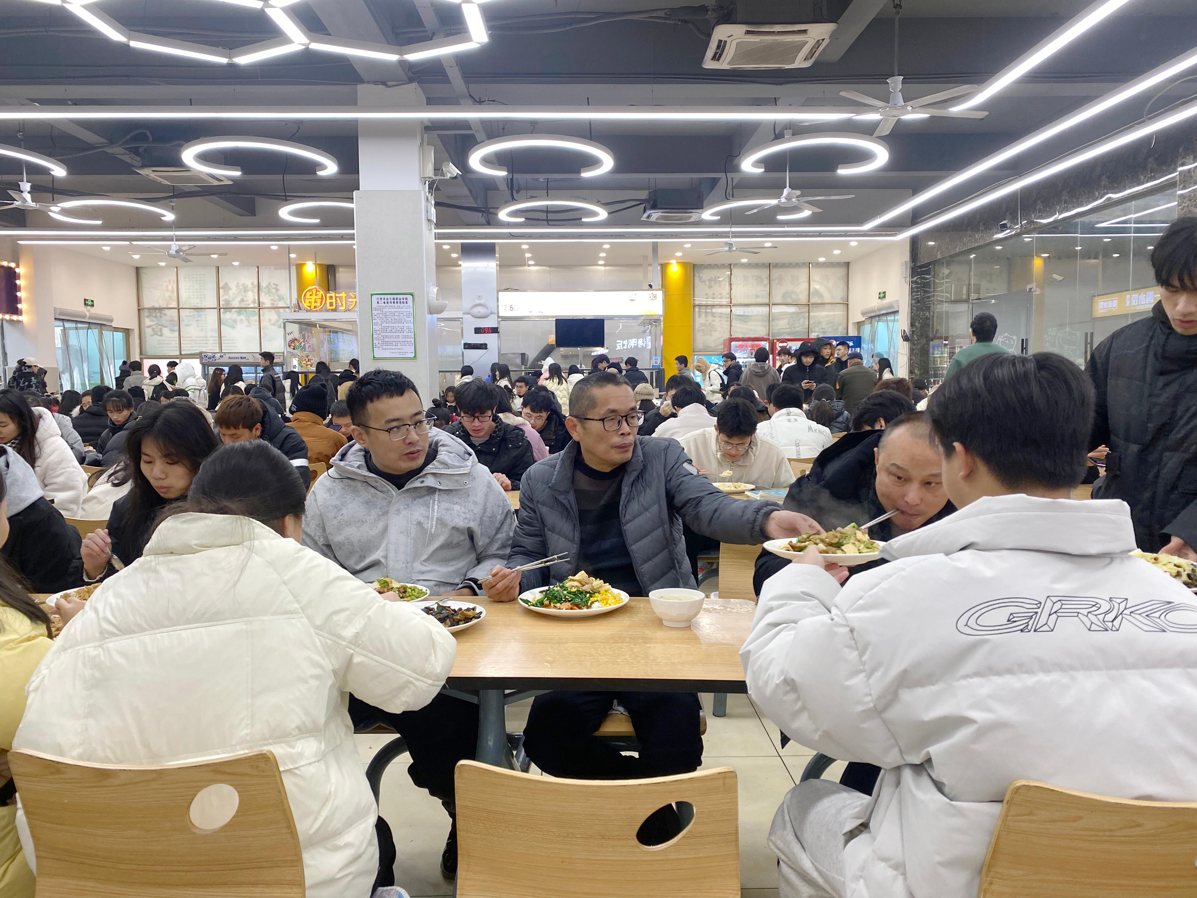 中午,周维走进食堂一边吃着饭一边和大家聊天,他鼓励同学们多和学院沟通,多反馈问题,询问生活上是否有困难。同时叮嘱后勤管理人员一定要加强食品安全及卫生保障,合理定价,提高饭菜质量,确保学生吃的健康、安全。