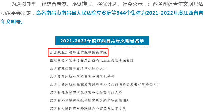 近日,江西省创建青年文明号活动组委会揭晓2021-2022年度江西省青年文明号评选结果,江西农业工程职业学院中医药学院荣获“2021-2022年度江西省青年文明号”。