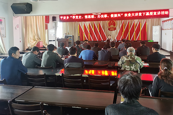 宣讲团分别进入平定乡、潢溪镇等乡镇,开展宣讲活动。宣讲团成员以“习近平总书记在党史学习动员大会上的讲话精神”“学党史、悟思想、办实事、促振兴”等为主题进行党史学习教育宣讲,围绕《实施乡村振兴战略,建设社会主义现代化国家》、解读《乡村振兴条例》开展新思想新政策集中宣讲,参加听讲的乡村干部、新型经济经营主体负责人、种粮大户和农民共200余人。