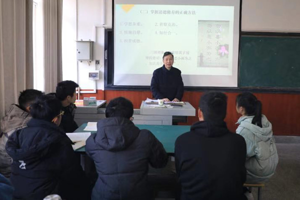 上午九点,杨帆来到20级本科园林班《思想道德修养与法律基础》课课堂。本堂课,任课教师与同学们正在进行“加强道德修养 锤炼高尚品德”的专题教学。杨帆与老师和同学们打过招呼后,找空位坐下,与同学们一起听课。他一边听一边记,同时留意同学们的课堂反应。