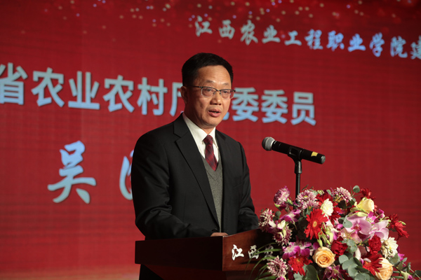 吴国昌受江枝英书记、胡汉平厅长的委托,代表省农业农村厅向学院表示热烈祝贺,向各位嘉宾、各位校友表示热烈欢迎,向全体师生员工致以诚挚的问候。他指出,八十周年校庆,对学院来说,具有承前启后、继往开来的重大意义。学院要以习近平新时代中国特色社会主义思想为指导,坚定“四个自信”,增强“四个意识”,坚决做到“两个维护”。他强调,学院在办学过程中,要坚持社会主义办学方向,坚持党的全面领导,坚持人才兴校的发展战略,落实立德树人根本任务,要在探索农业职业院校高质量发展的道路上迈出新步伐,要在推进双高建设上取得新的突破,要在服务农业农村现代化上续写新篇章,走出一条富有特色的办学道路,为提高我省农业科技水平作出更大贡献。