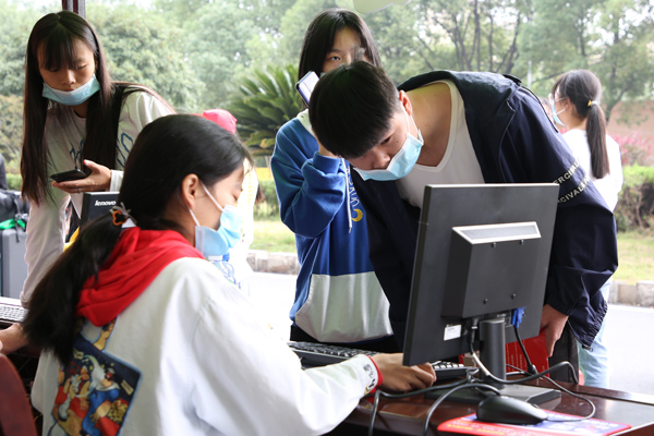 根据疫情防控要求,新生、家长及学院师生员工都佩戴了口罩。新生到达校门口,走专用安全通道,扫健康码,测量体温后进入校园。志愿者活力满满,提供一条龙暖心服务,全程引导新生办理每一项入学手续,完成注册、缴费、领取饭卡与生活用品,入住宿舍等。工作人员耐心解答新生和家长的问题,直到他们脸上露出满意的笑容。