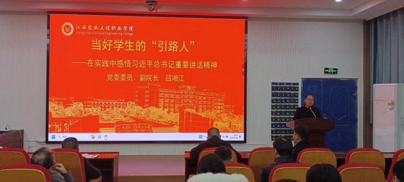 晚上,吕湘江以《当好学生的“引路人” 在实践中感悟习近平总书记重要讲话精神》为题,为党员、班主任(辅导员)、入党积极分子上了一堂思政课。他从德高为师、行为世范,确定班级建设目标,重视班规的制定,注重培养班干部队伍和加强学生的心理健康教育等五个方面,引导教师做“四有”好老师、做学生的“四个”引路人,并勉励同学们坚定不移听党话、跟党走,做有理想、敢担当、能吃苦、肯奋斗的新时代好青年。