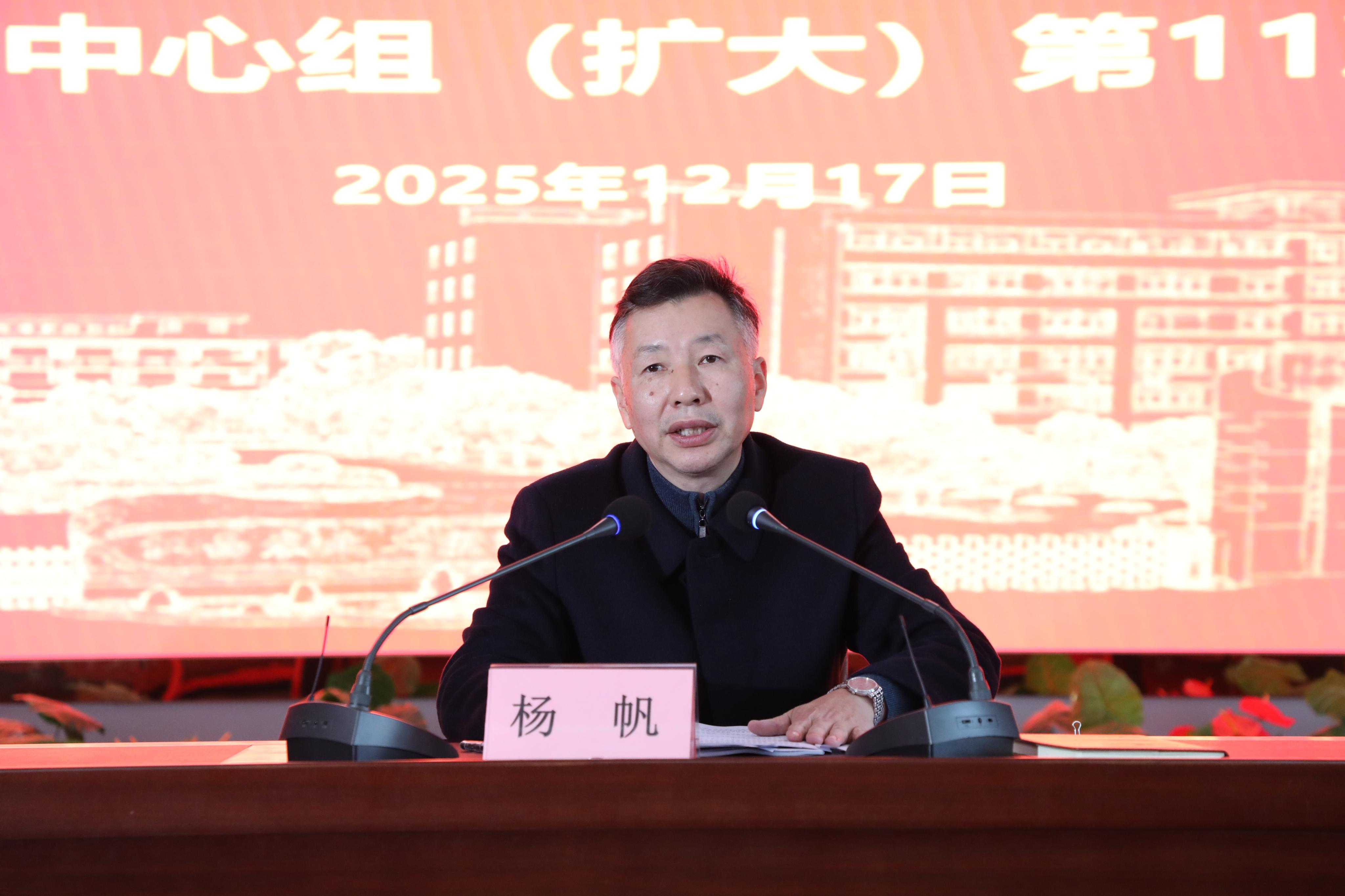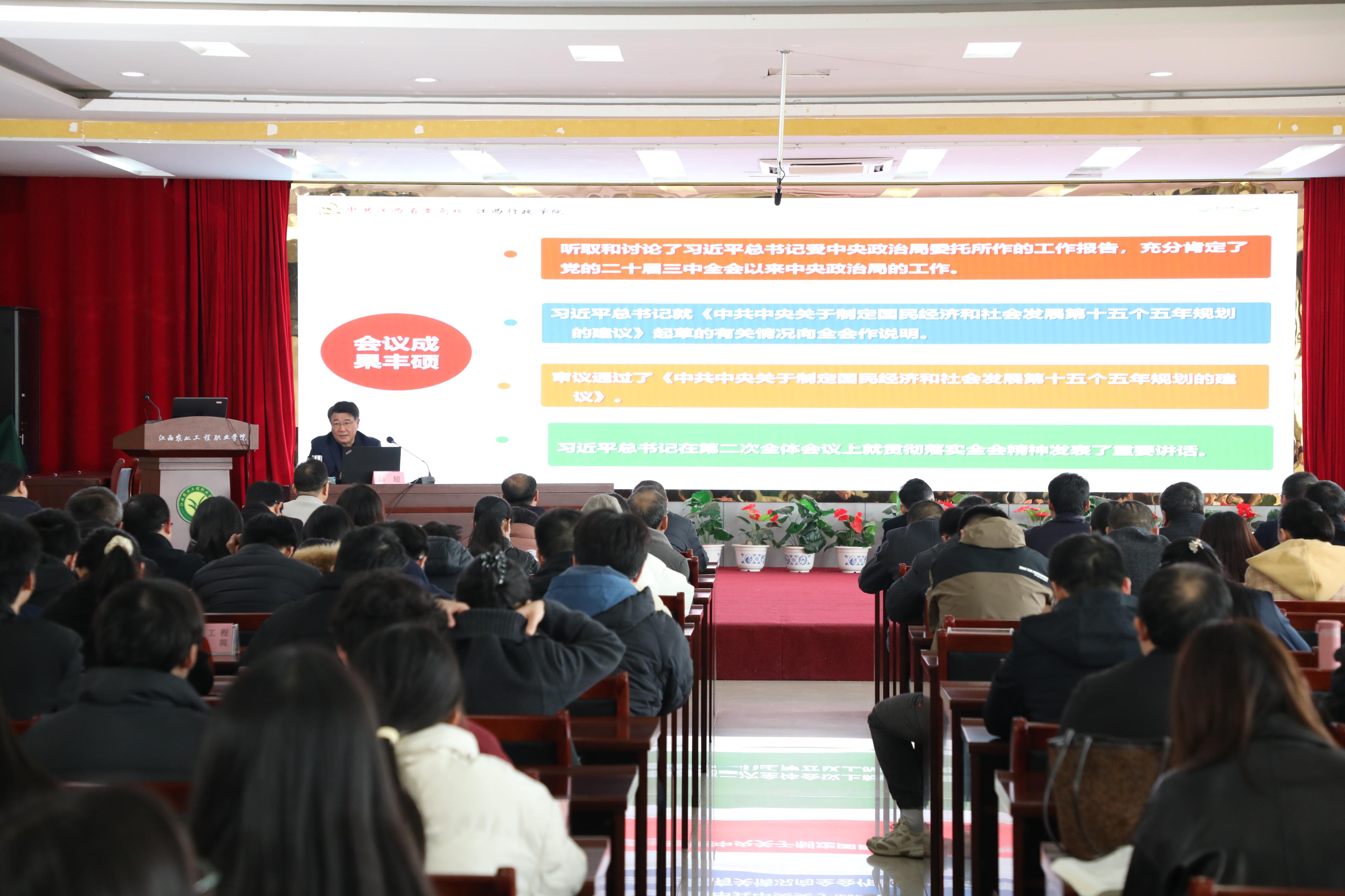 11月17日,学院在多功能报告厅召开党委理论学习中心组(扩大)第11次集体学习会。会议聆听了省委党校原副校长杨超做《学习领会党的二十届四中全会精神》专题辅导报告,传达学习了中央经济工作会议精神。学院党委书记杨帆主持会议并作总结讲话,在家院领导参加了会议。