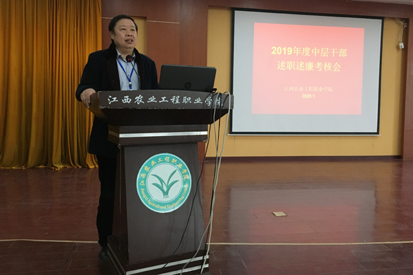 1月3日,学院2019年度中层干部述职述廉考核会在多功能报告厅举行。院领导、中层干部及群众测评代表参加了会议。学院党委书记、院长谭酬志出席并讲话。学院党委副书记、副院长张辉主持会议。