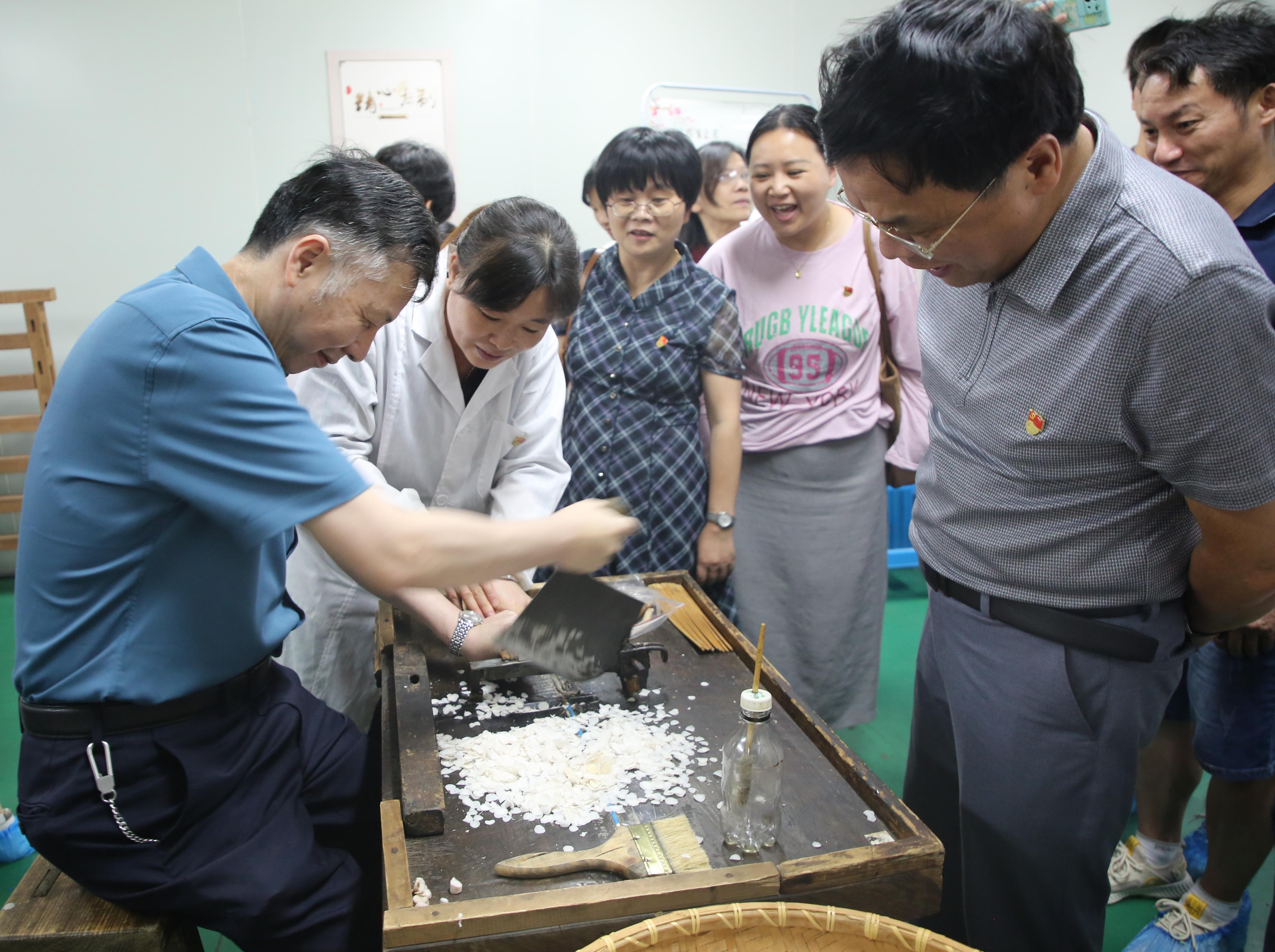 学院领导和党员老师在公司张小波的带领下走进公司的中药饮片生产车间,详细了解公司的主要业务板块,实地感受现代化的中药加工工艺、智能包装生产;在“樟帮”传统手工炮制传承班,张小波详细介绍了“樟帮”的发展历程和诚信经营、敢闯敢拼的丰富内涵以及“制虽繁必不省人工”的匠心精神,近距离观看“樟帮”独特的中药炮制技术;党员同志还在“樟帮”非遗传承人的指导下亲身体验白芍、陈皮的铡刀切制和水泛丸炮制技术,感受樟帮传统技艺深厚的文化内涵。党员同志们纷纷表示,通过观看中药炮制技艺大师们的技艺,体会到了他们勇于探索、苦练本领、坚持不懈的匠人精神。