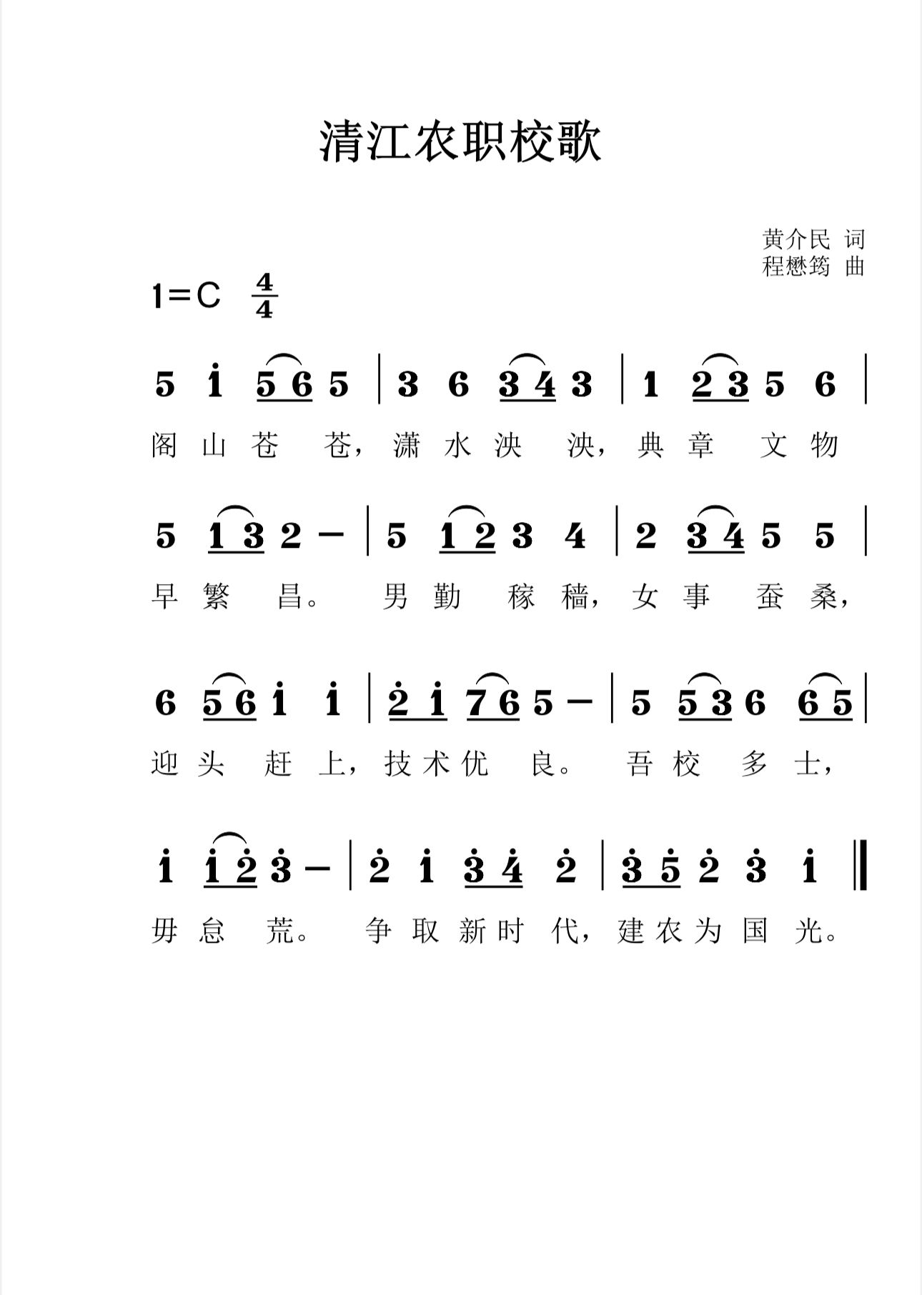 清江农职校时期题名《清江农职校歌》。黄介民作词、程懋筠作曲。