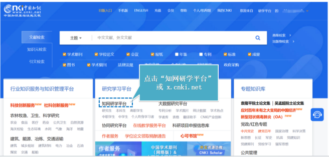 方法①:打开中国知网(cnki.net),点击中间知网研学平台;