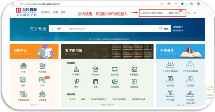 校园网 IP 范围内,进入万方数据知识服务云平台官网,无需登入即可直接 使用资源。