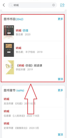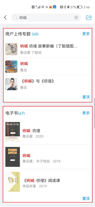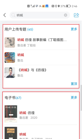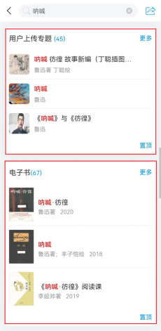 ①搜索框中直接搜索电子图书(例:《呐喊》),在三个模块中会有显示,根据电子图书后期加工的情况显示在不同位置::图书书目、电子书、用户上传专题这三个模块。