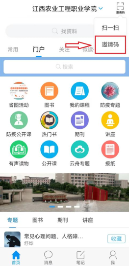 2.移动端阅读(仅展示电子图书,还包含期刊、视频、专题、报纸等):移动端在学院学习通首页右上角输入邀请码“jxnygc”进入图书馆界面。
