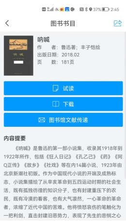 - 图书书目模块中阅读:试读、下载(下载到书架,在“我”里面)、文献传递(传递到个人邮箱)
