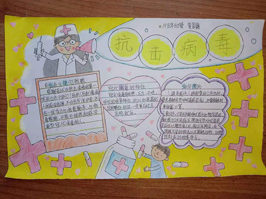 同学们围绕当前疫情,利用家里现有的资源,制作手抄报。手抄报的内容形式多种多样,各具特色,图文并茂。老师将同学们发来的手抄报一一做了点评,并鼓励同学们继续努力。虽然不能像那些医务工作者那样奋战在一线,但是可以在家里学习防疫知识,线上宣传防疫知识,把自己对基层一线工作者的祝福全都写在纸上,来为武汉人民祈福,为中国人民祈福。