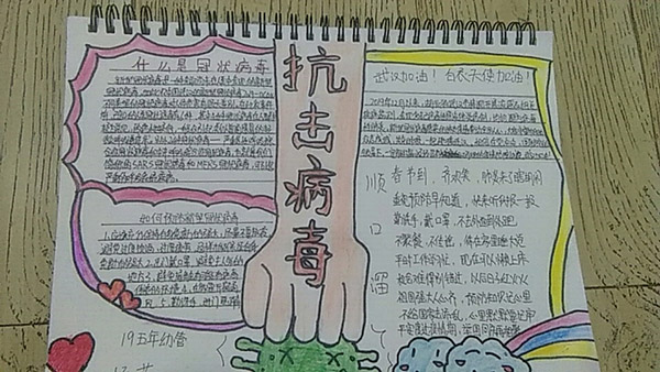 在这个非常时刻,19五年幼管班在不出门的前提下,开展了以手抄报形式学习宣传新型冠状病毒防疫知识的活动,使学生们充分了解疫情防控知识,提高健康意识和自我防控能力。同学们和家人在一起学习防疫知识,写关于“武汉加油,中国加油”“万众一心,众志成城,抗战疫情”等鼓励祝福的话,来表达对奋战在一线的工作者诚挚的祝福,也为武汉加油。