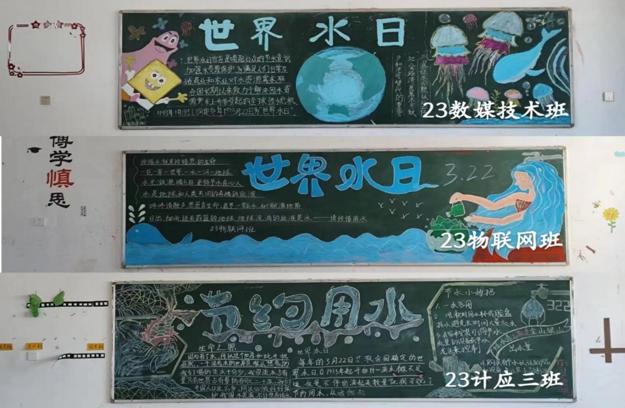 活动开展以来,各班积极响应,认真准备。黑板报作品内容丰富多样,既有对水资源现状的深入分析,也有节水知识的普及,还有对未来水安全保障的展望。每一块黑板都凝聚了同学们的智慧和汗水,成为了传递节水理念的重要载体。黑板报评比活动经分院评选,23数媒技术班获得一等奖,23级物联网班获得二等奖,23级计应三班获得三等奖。