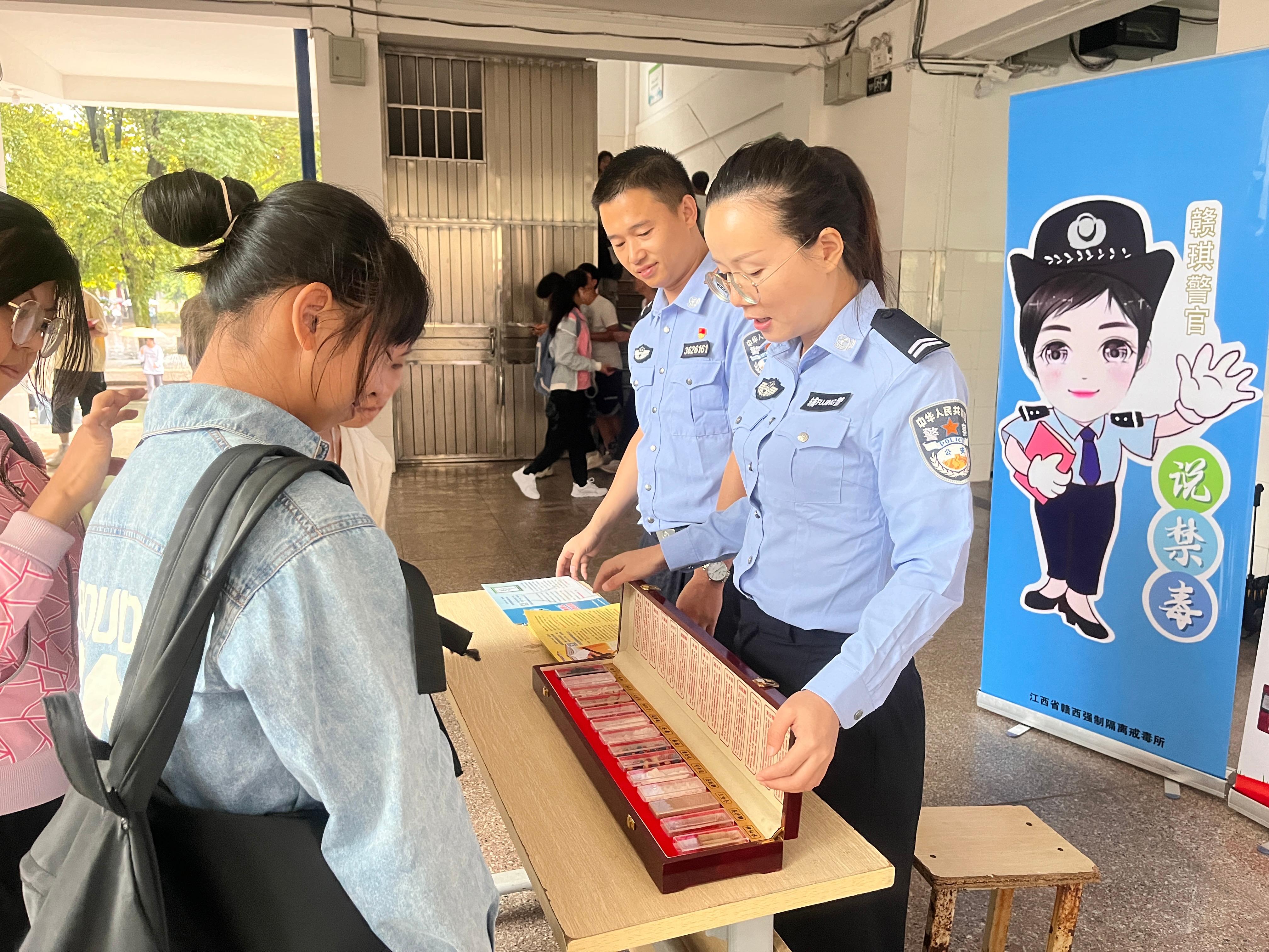 在设置的毒品仿真模型展示区,禁毒民警向同学们展示禁毒仿真品,通过近距离观摩仿真毒品模型,知道了毒品的种类和危害,增强了对毒品的警惕性。