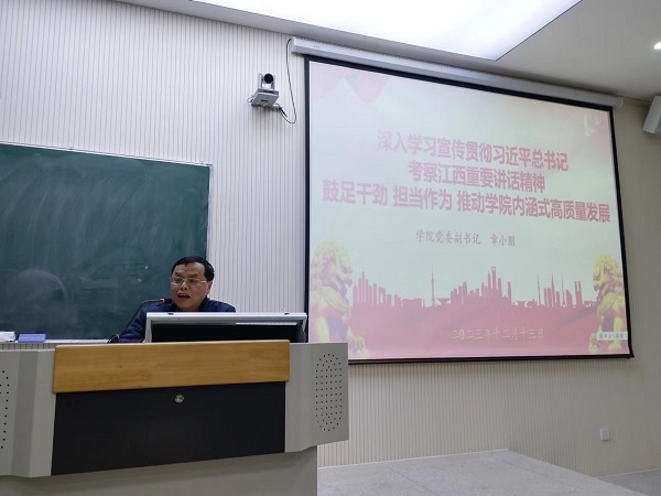 章小朋同志向大家传达了习总书记视察江西的重要讲话精神,深入解读了习近平总书记考察江西重要讲话精神的重大意义,让大家领会习近平总书记考察江西重要讲话精神实质,勉励大家全面贯彻习近平总书记考察江西重要讲话精神,推动学院内涵式高质量发展。