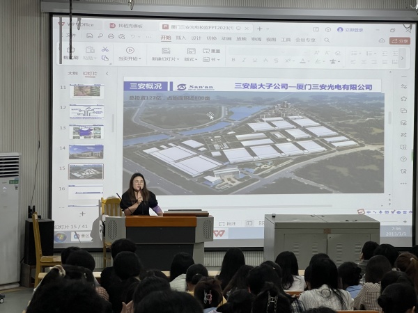 6月5日晚7点,我院优秀校友—05模具班黄梦琴同学(厦门三安光电有限公司校园招聘经理)一行五人来到我校进行企业宣讲,来自22机电1-2班、22机器人班、20五年机电1-3班共计228位同学参加了此次宣讲,宣讲在第一多媒体进行。