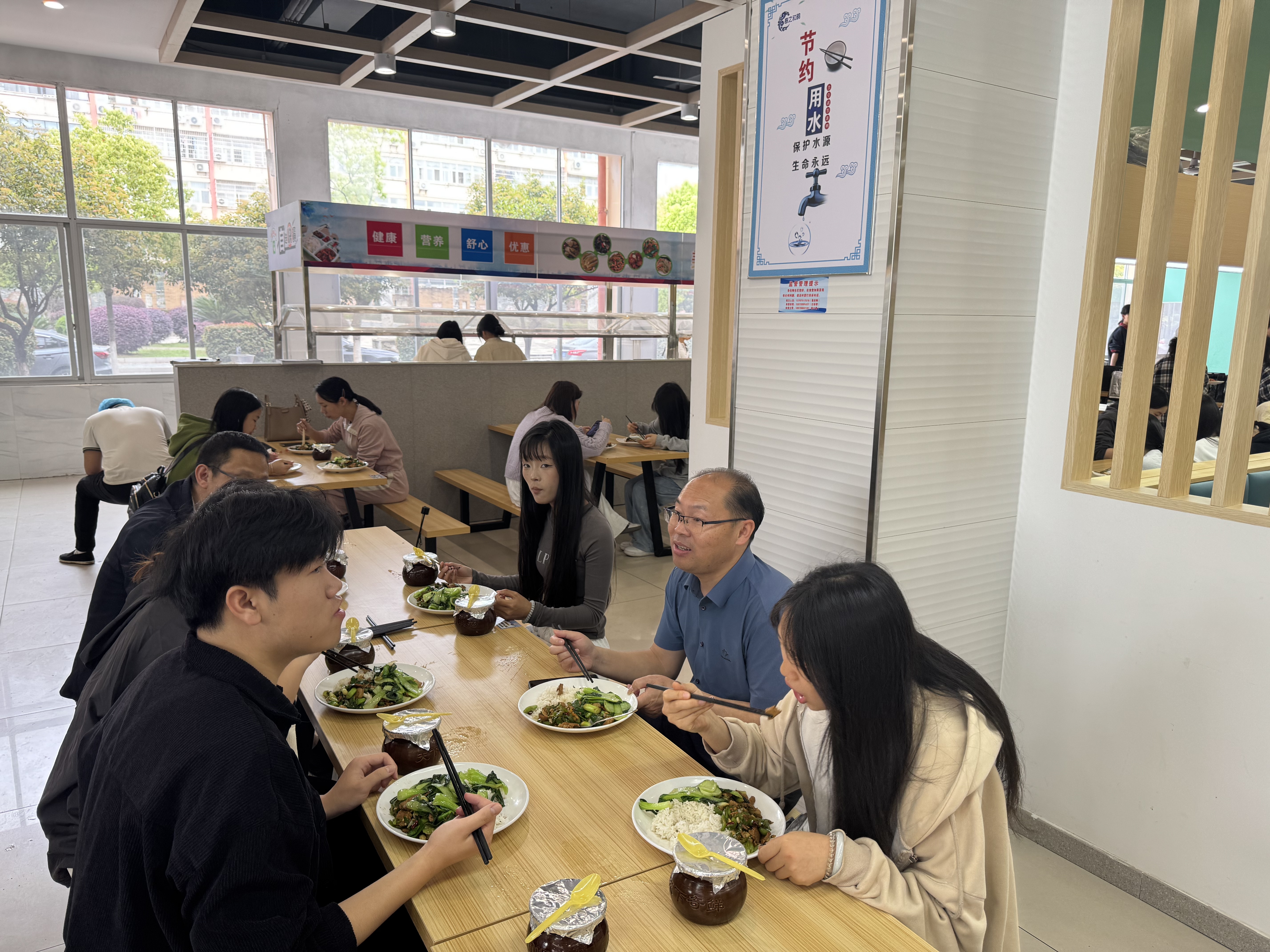 中午,吕湘江走进食堂,与同学们同桌用餐,面对面交流。亲切询问同学们饭菜是否可口,饭菜价格、口味、环境等方面的感受和建议,了解学生学习和生活情况,他鼓励同学们要做好学业规划,积极参加各类活动,不断提高综合素质,实现自己的人生价值。