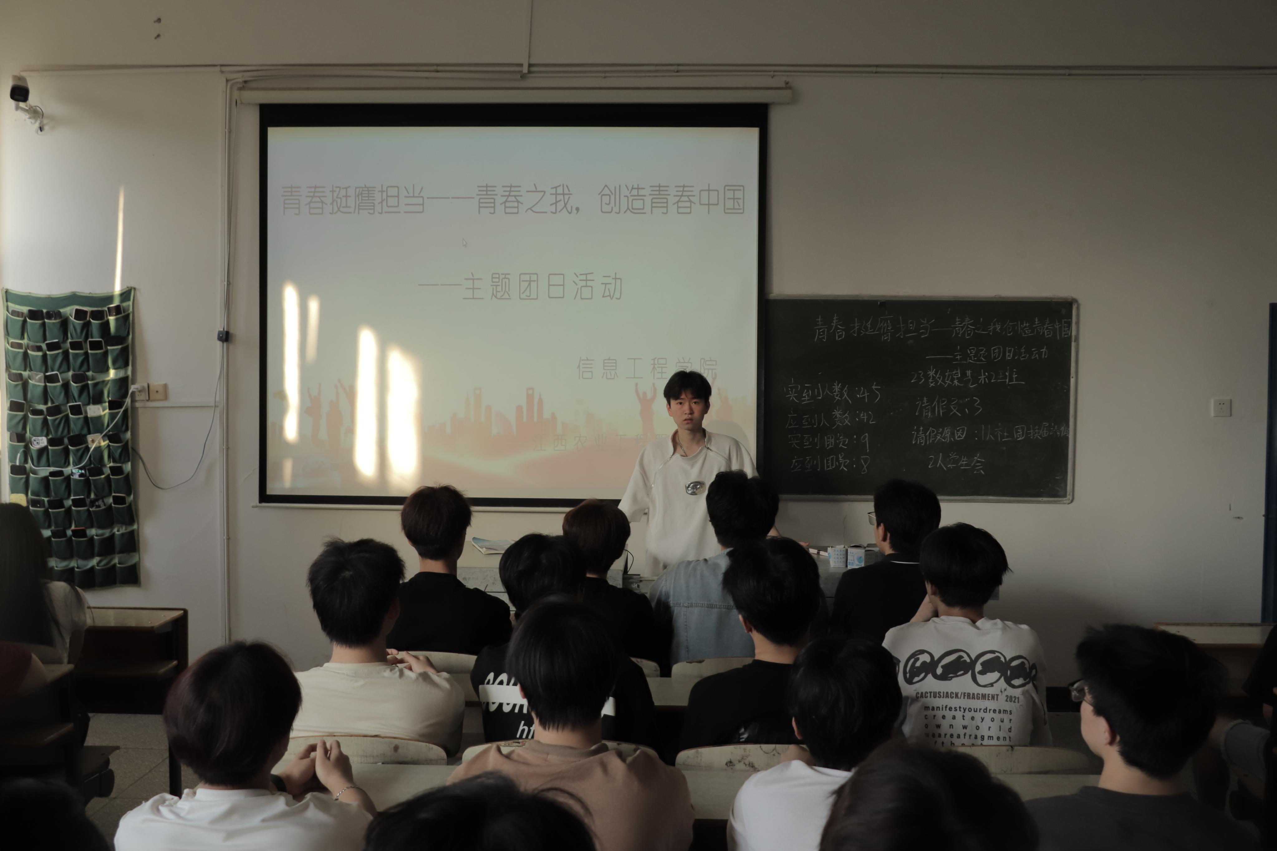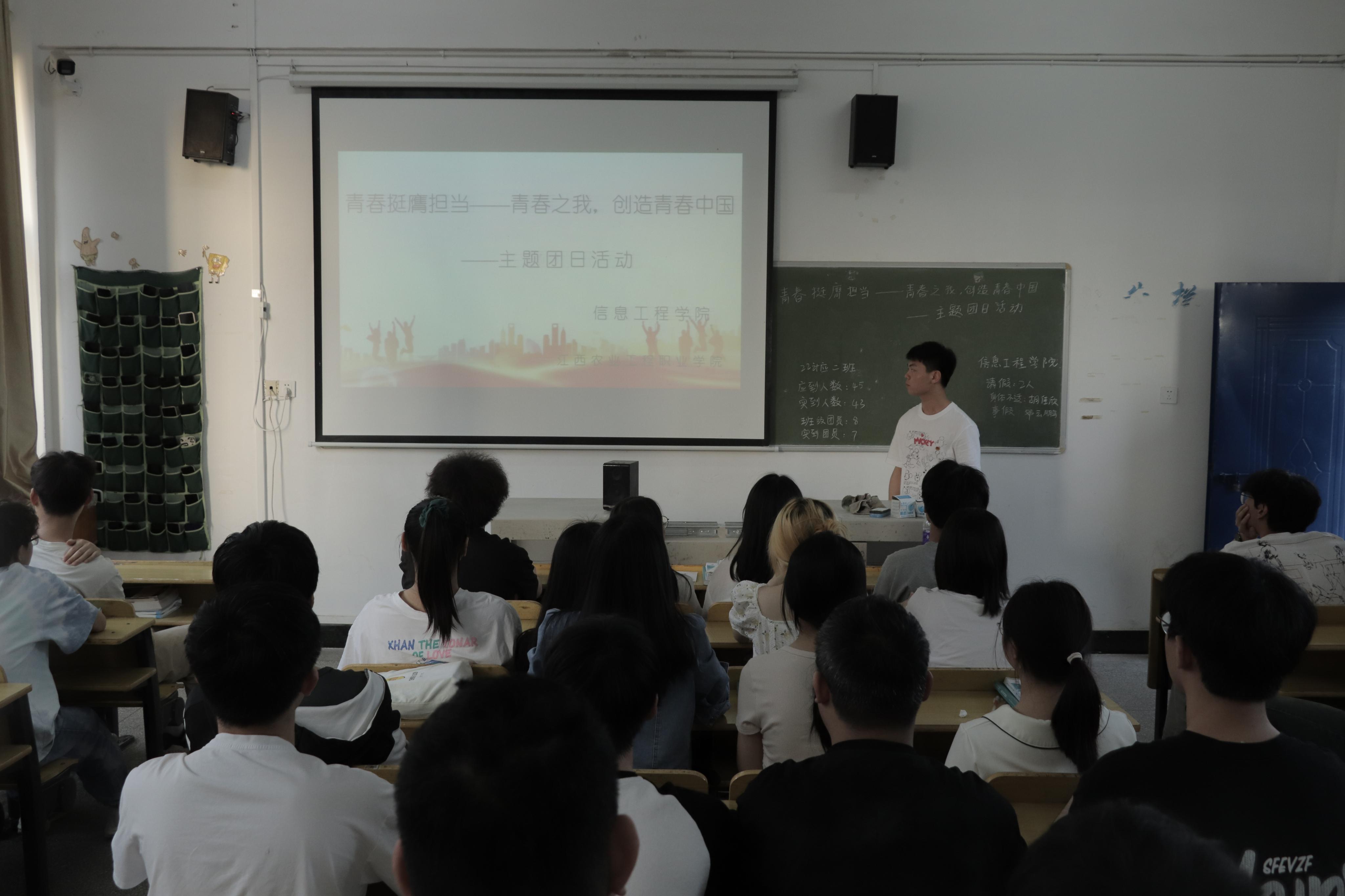 活动伊始,各班团支书带领团员青年们观看青年榜样的视频,让同学们了解到无数的青年人用自己的行动诠释着青春的担当,他们在各自的领域中努力拼搏,为实现中国梦奉献着自己的力量。在互动环节中,大家积极分享自己对青春的理解和对未来的憧憬。最后全体团员青年重温入团誓词,齐唱团歌。熟悉又庄严的誓词、激昂又振奋的旋律提醒着在场的每一位团员,要铭记团员使命,不忘入团初心,时刻提醒我们要在青春的舞台上,勇敢的担当起责任,用实际行动践行团员的誓言。